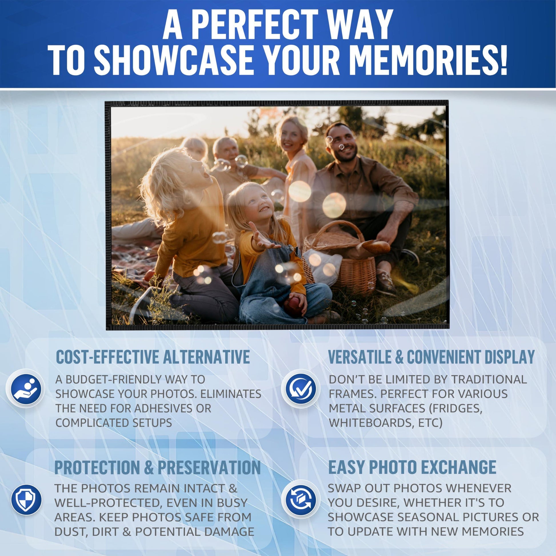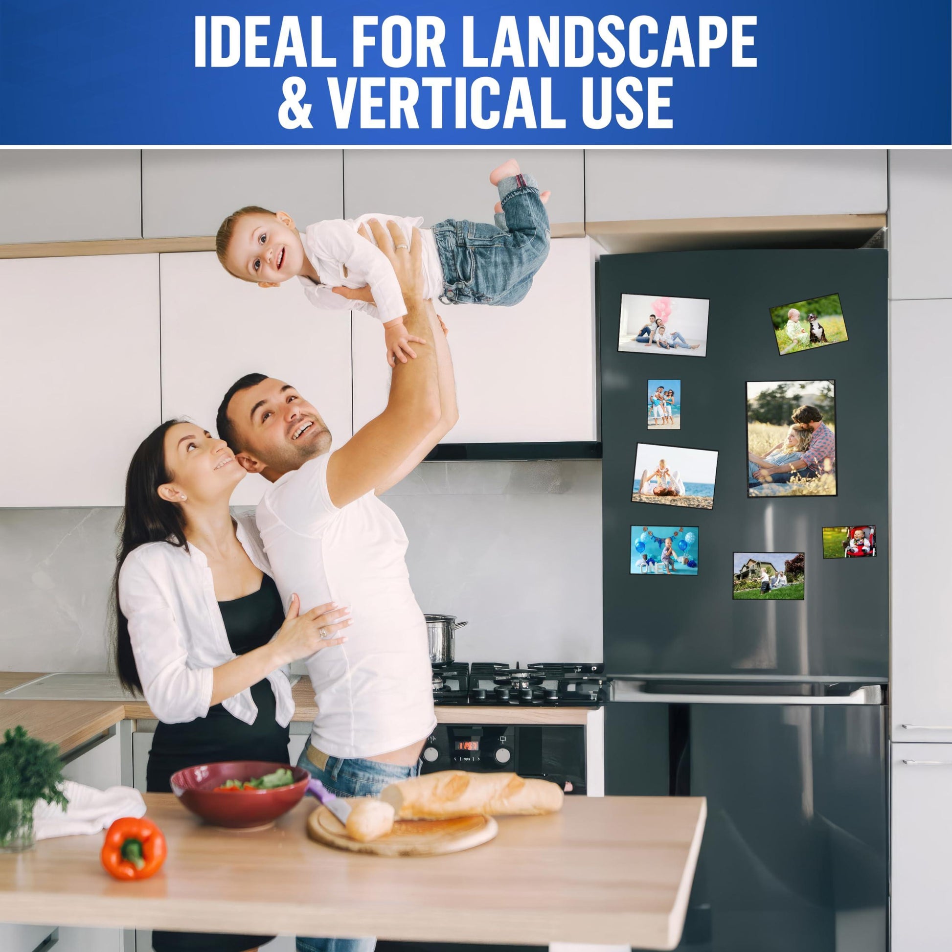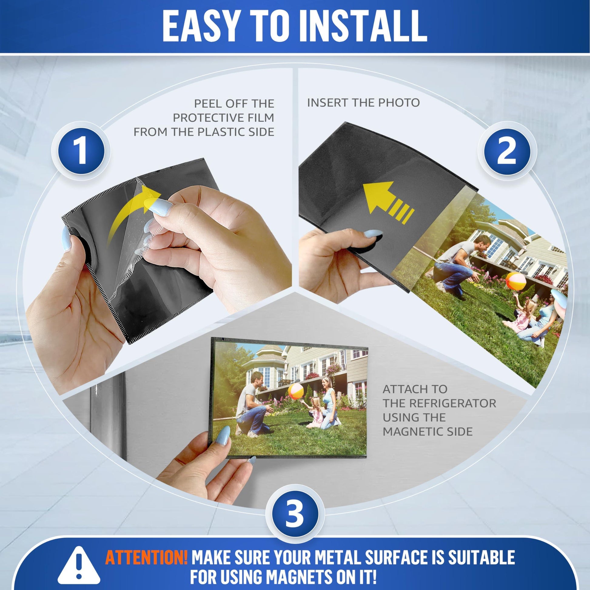 FULLY MAGNETIC - Our magnetic picture frame 8.5 x 11 inch photos suitable, feature a strong magnetic backing that securely holds onto metal surfaces like refrigerators, magnetic whiteboards & lockers. Display your memories effortlessly! CLEAR & PROTECTIVE COVER - With a clear cover, our magnetic display frame 8.5 x 11 protect your precious photos from sunlight. The scratch-proof design ensures long-lasting clarity, preserving your memories for years to come. VERSATILE ORIENTATION - Our magnetic frames for refrigerator allow you to display your photos in both vertical & horizontal orientations. Easily switch positions to suit your preferred style. PEEL OFF THE PROTECTIVE FILM FROM THE PLASTIC SIDE! DURABILITY & REUSABILITY - Created with high-quality materials, our magnet frames for refrigerator are built to last. The durable construction ensures your photos stay securely in place. Enjoy the reusability for endless photo display possibilities. WIDE APPLICATIONS - Whether at home or in the office, with our photo sleeves magnetic you can easily showcase your photos or documents on any metal surface. From refrigerators, metal cabinets & doors to whiteboards, the possibilities are endless.