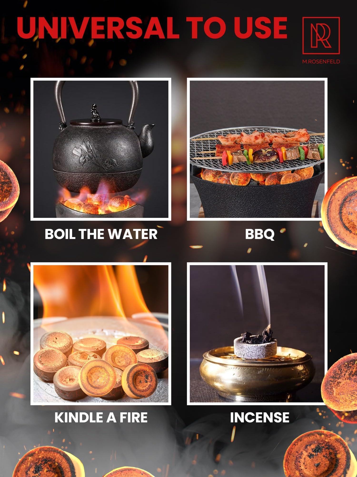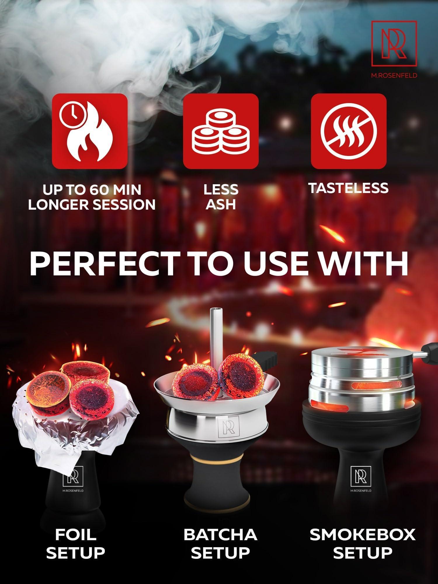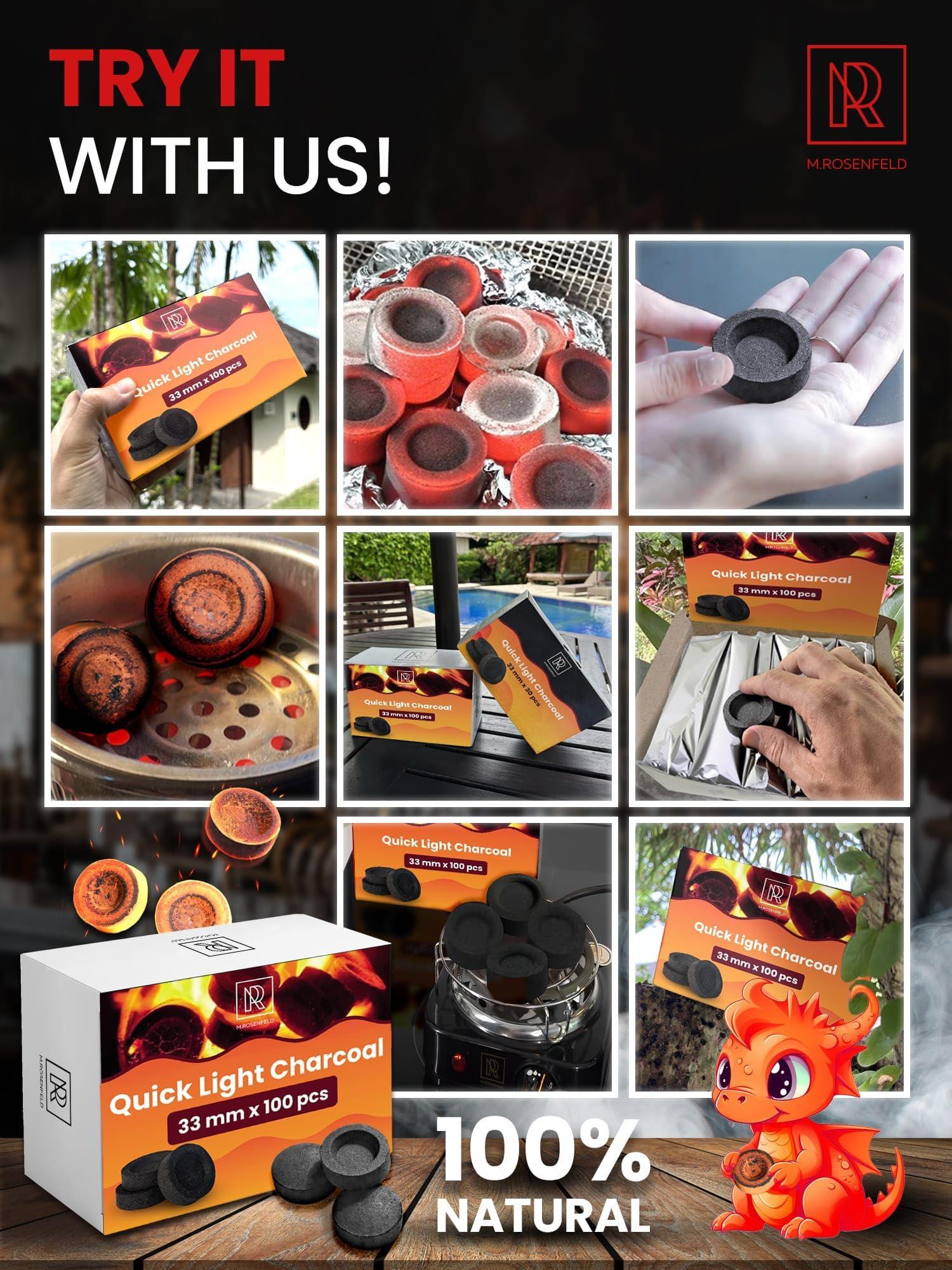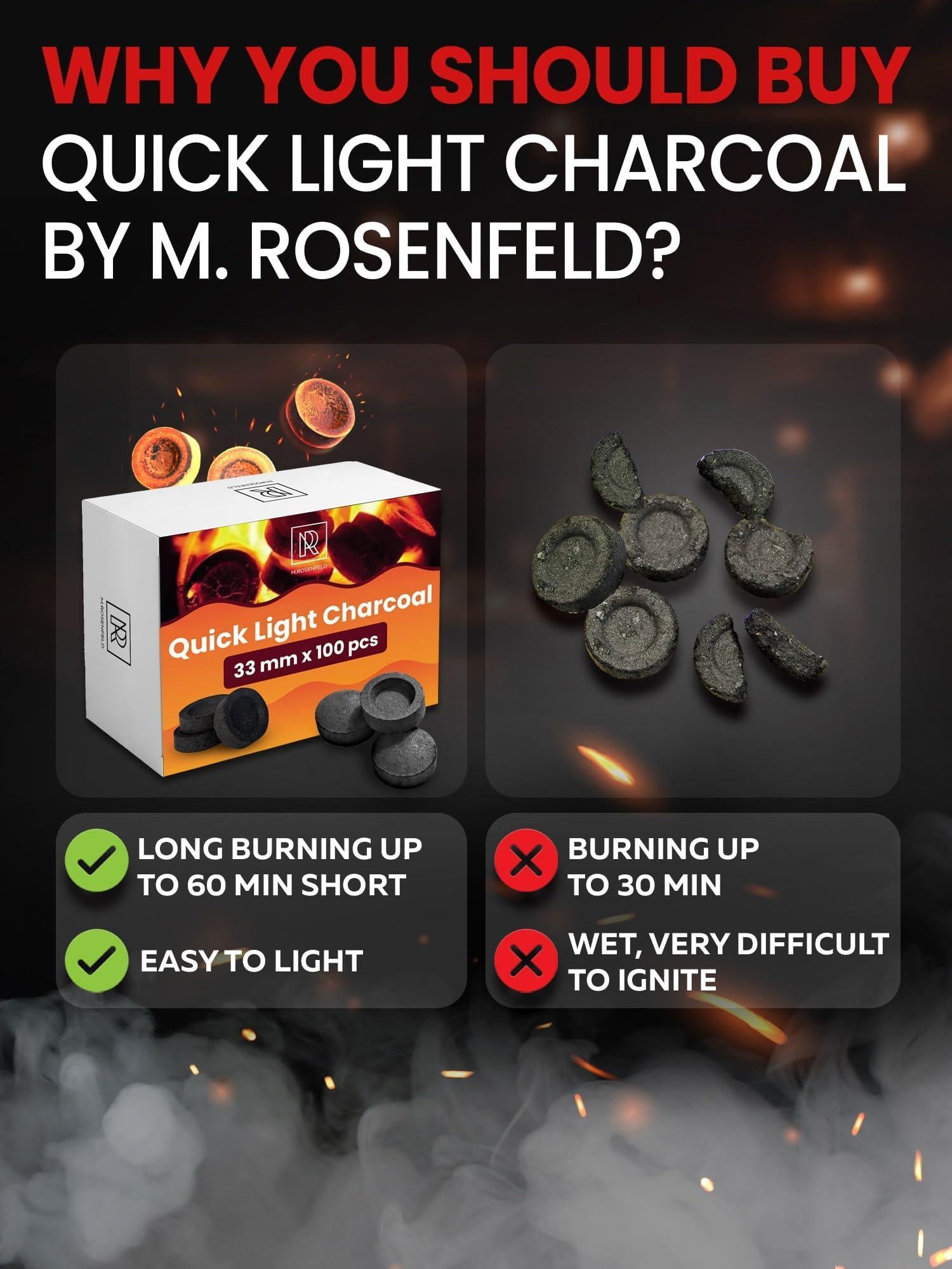 THE FASTEST COALS - Our customers rave about our charcoal rounds for a reason. Why? Because it takes just one match to instantly light them up. Our charcoal disk for incense burning are entirely odorless, providing you with a clean burning experience. Indulge in Your Best Hookah or aromatherapy and Turkish treatments, all thanks to these remarkable coal lighters. Enjoy the convenience and purity in every spark! LONG BURNING - Our charcoal tablets incense briquette for incense and smoking charcoal offers an impressive burn time of up to 60 minutes, maintaining a steady flame throughout. The light tablets are completely odorless, ensuring you can fully immerse yourself in the rich aroma of your chosen herbal flavor. EASY TO LIGHT UP - Our quick-light charcoal is designed for effortless ignition using a simple lighter or match. Enjoy the convenience of swift and hassle-free setup, allowing you to delve into your best hookah session or burn the incense set experience without delay. VERSATILE USAGE - These round hookah coals are universally adaptable. Beyond hookah sessions, they serve diverse purposes such as BBQ coals, charcoal grilling, boiling water, and kindling a fire. Experience their multipurpose convenience for all your charcoal needs. IDEAL FOR INCENSE - Our quick-light incense coals is perfectly suited for burn incense use. Elevate your incense rituals with our high-quality quick-light charcoal incense discs. GERMAN BRAND. 60 DAYS FREE RETURNS - We provide 24/7 professional English speaking support. Dont like your new charcoal pellets or any othe coals? No problem at all. You have 60 days to return or replace. HOW TO USE IT - It's quick light hookah coals and it's very easy to use. Just use torch lighter or match. They light up in seconds and burn for up to 60 minutes, and 100 pcs charcoal box will be enough for up to 100 sessions. HIGH QUALITY - Our charcoal box are made from pure fruitwood and are absolutely Odorless, Tasteless, and very Strong. If your coal falls down, it will not break.