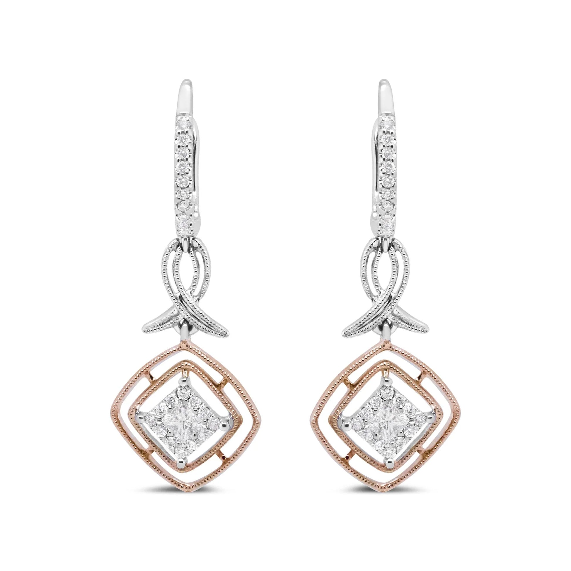 These two-tone diamond dangle earrings are so unique and refreshing, crafted from genuine 14k white and rose gold. This piece starts with an upper dangle which is set with round white diamonds in prong settings. The middle dangle is a ribbon silhouette framed by delicate milgrain detail. The centerpiece of this pair is a princess cut diamond in the embrace of a prong setting and haloed by round diamonds in their own prong settings. The openwork motif around this centerpiece features additional milgrain detail that really enhances the style of these glamorous earrings. The diamonds total 1/2 cttw with an approximate G-H Color and SI2-I1 Clarity. Lever backs keep these earrings safe and secure on your ears for comfortable, worry-free wear all day long.