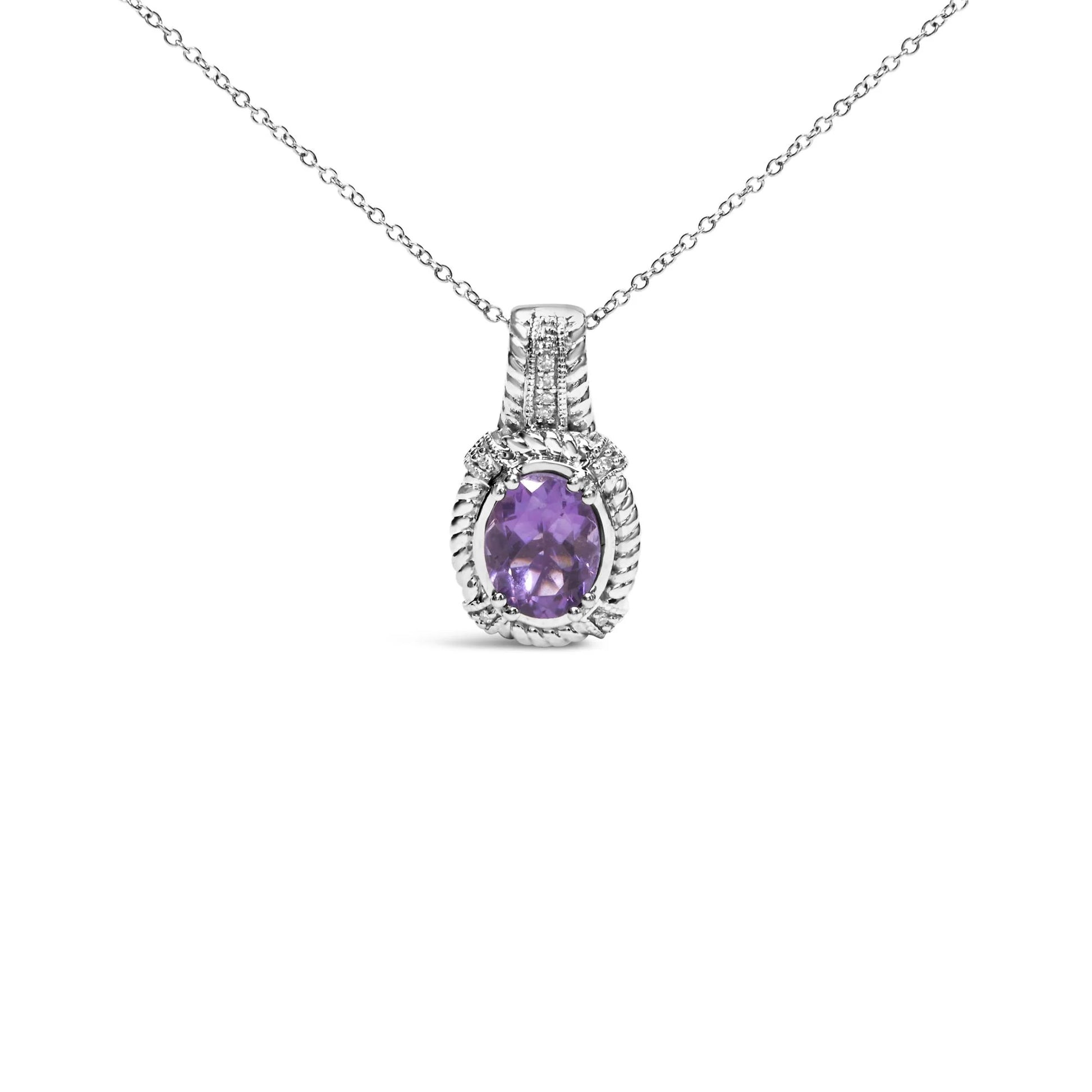 .925 Sterling Silver 9x7mm Oval Purple Amethyst and Round Diamond Accent Fashion Drop Pendant 18 Inch Necklace (I-J Color, I1-I2 Clarity)