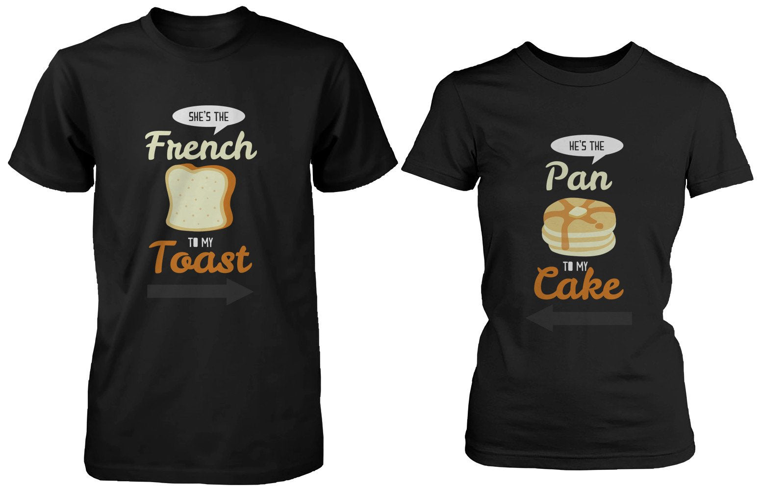 Looking for a super cute and fun t-shirt set for you and your significant other to wear together? Well, look no further because it doesn’t get much more adorable than this tee set for couples! One of the black t-shirts has the cute phrase “She’s the French To My Toast” printed on the front of it along with an image of a piece of toast, while the other shirt features the quote “He’s the Pan to My Cake” accompanied by an image of a stack of pancakes.