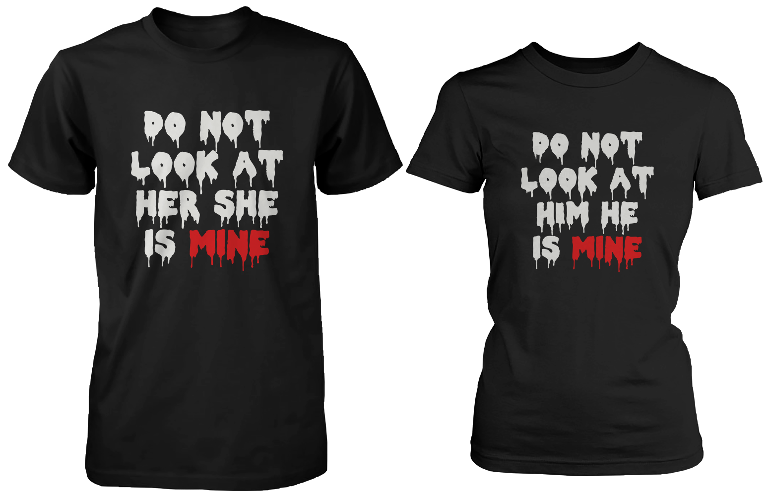Set of two, each shirt has "Do Not Look At Her She Is Mine / Him He Is Mine" printed in the center with ghostly fonts. The enzyme washed fabric provides an extra soft touch, providing maximum comfort.
