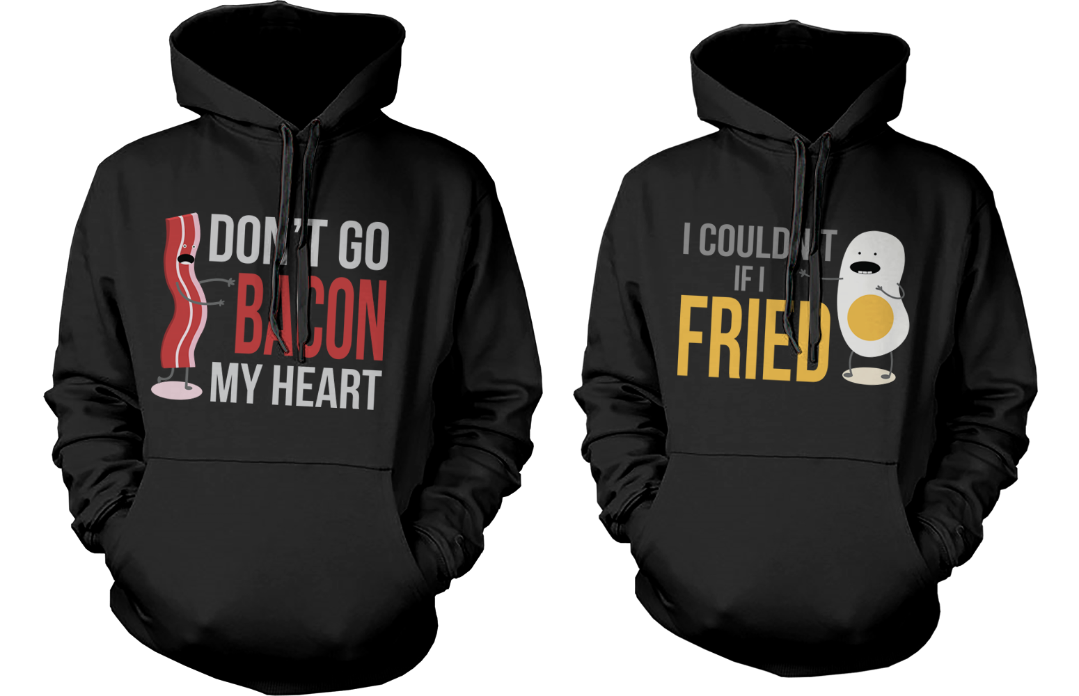 During the cold season, it's all about being romantic and staying cuddly and warm with your loved ones. Our Don't Go Bacon My Heart, I Couldn't If I Fried hoodie set will melt your heart and body with its cute phrase and design. These hoodies could be worn between couples, best friends, and even between family members, because unconditional love is the greatest love of all. Made in USA, our couples matching hooded sweatshirts are individually printed using a digital printer and quality is assured. Put smiles on your loved ones with these cute gifts!