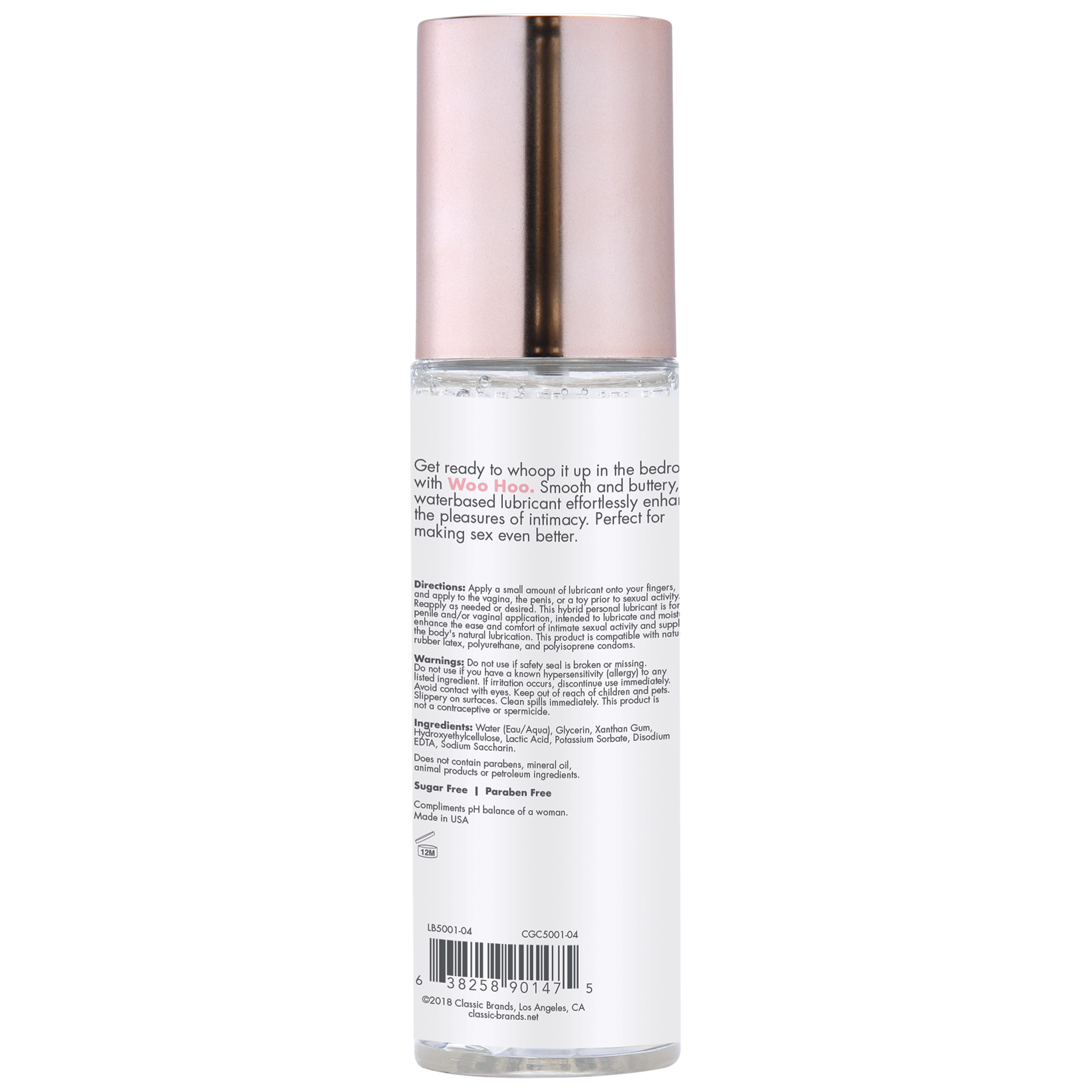 Get ready to whoop it up in the bedroom with Woo Hoo. Smooth and buttery, this water based lubricant effortlessly enhances the pleasures of intimacy. Perfect for making sex even better.Apply a small amount of lubricant onto your fingers, and apply to the vagina, penis, or a toy prior to sexual activity. Reapply as needed or desired. This hybrid personal lubricant is for penile and/or vaginal application, intended to lubricate and moisturize, enhance the ease and comfort of intimate sexual activity and supplement the body's natural lubrication. This product is compatible with natural rubber latex, polyurethane, and polyisoprene condoms.Compliments pH balance of a woman. Made in the USA. Water (Eau/Aqua), Glycerin, Xanthan Gum, Hydroxyethylcellulose, Lactic Acid, Potassium Sorbate, Disodium EDTA, Sodium Saccharin.