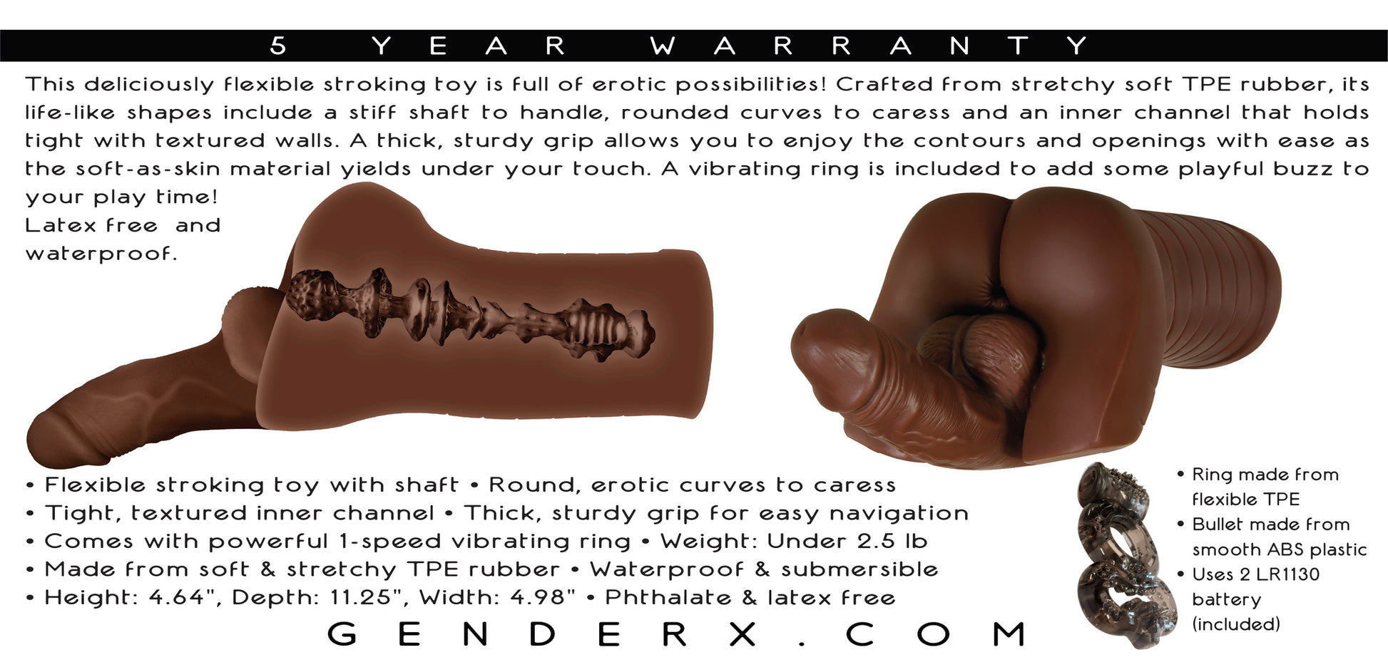 This deliciously firm and flexible stroking toy is full of erotic possibilities! Crafted from stretchy soft TPE rubber, its life-like shapes include a stiff shaft to handle, rounded curves to caress and an inner channel that holds tight with textured walls. A thick, sturdy grip allows you to enjoy the contours and openings with ease as the soft-as-skin material yields under your touch. A vibrating ring is included to add some playful buzz to your play time! Latex free and waterproof.