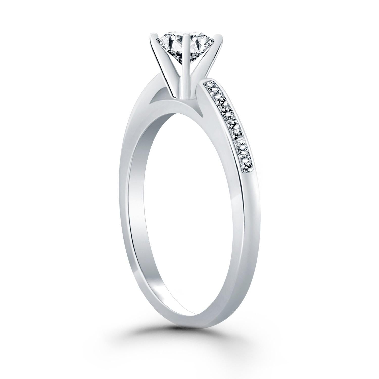A brilliant row of channel set diamonds highlights the center diamond of this elegant cathedral silhouette engagement ring. Expertly crafted in 14k white gold, the center highlights a sparkling 1/2 carat round cut diamond. The bright mirror finish adds to the allure.