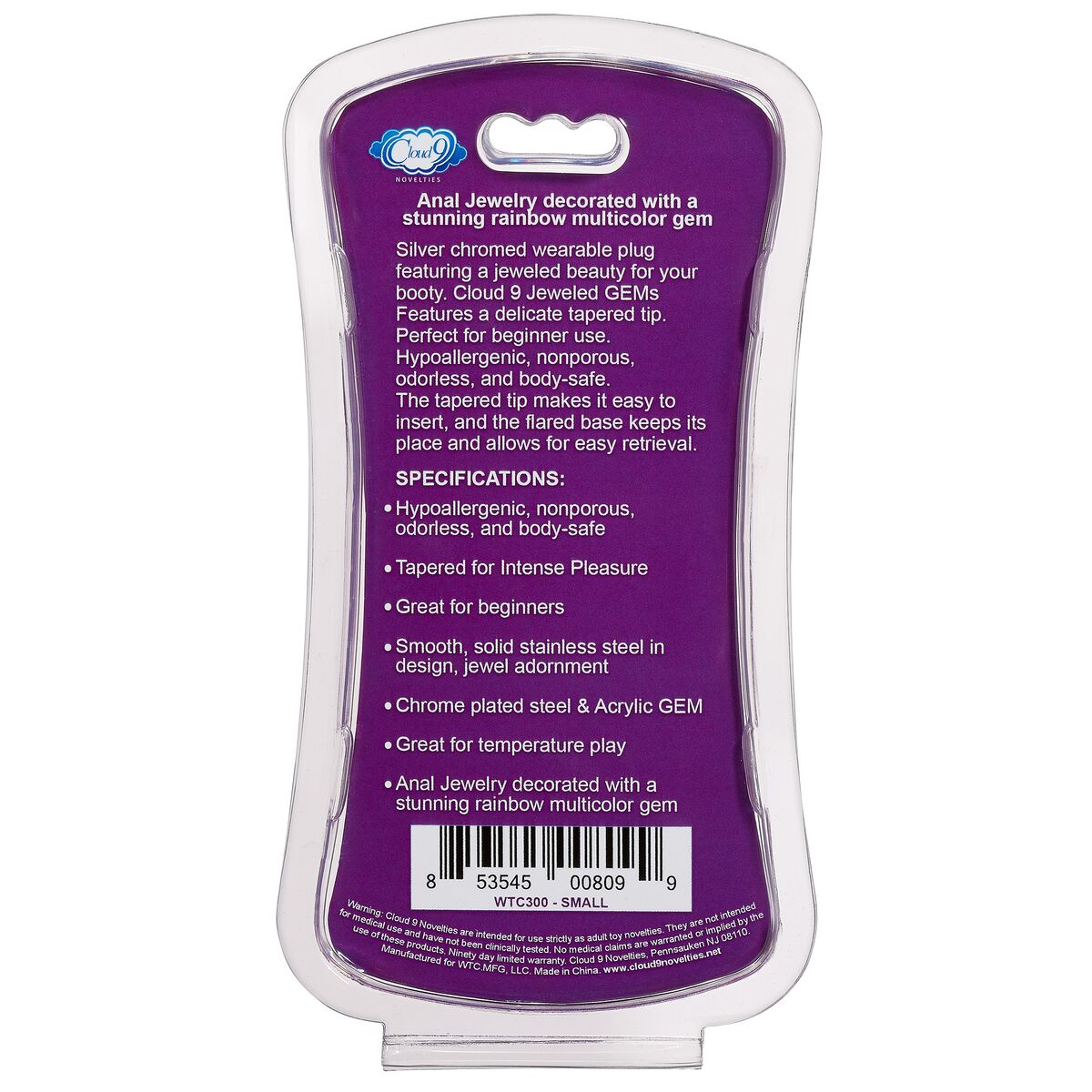 Cloud 9 Gems Silver Chromed Anal Plug . Cloud 9 Novelties Anal Gems Jeweled Silver Chromed Anal Plug. Anal Jewelry decorated with a stunning rainbow multicolor gem. Silver chromed wearable stainless steel butt plug featuring a jeweled beauty for your booty. Cloud 9 Jeweled Gems.