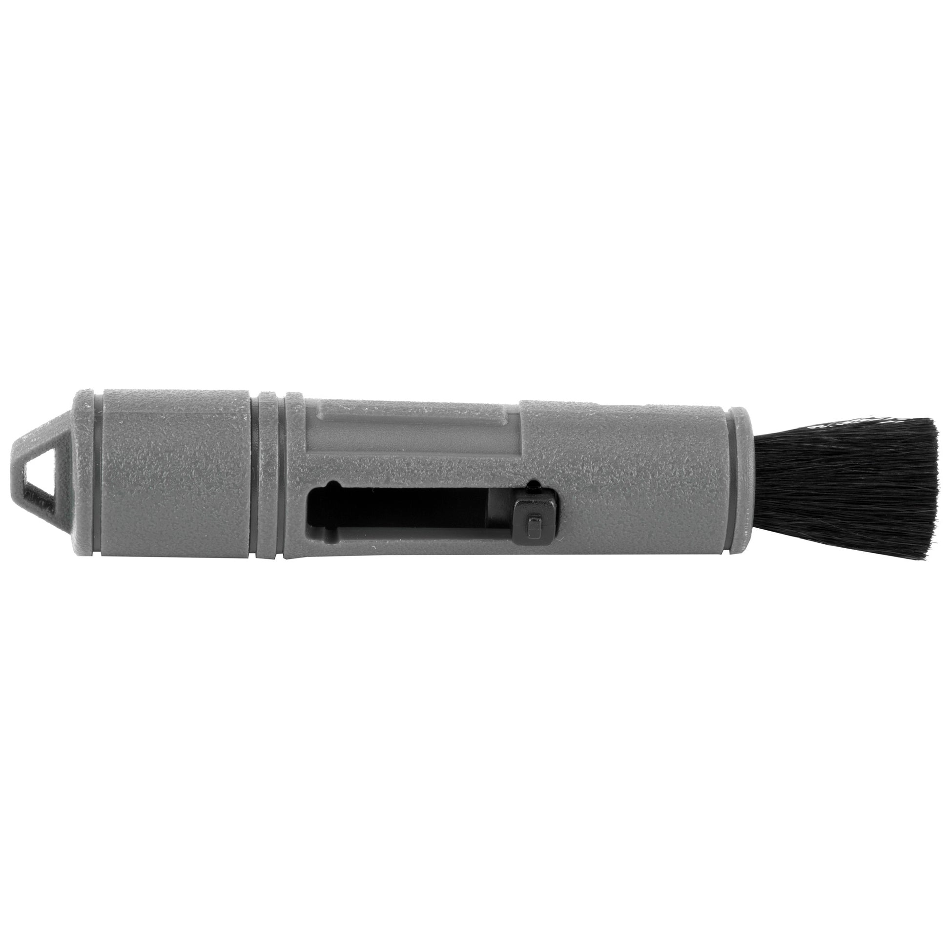 The retractable soft brush gets rid of dust and other lens debris. A chamois pad on the other end removes oils, fingerprints, and moisture with a self-replenishing cleaning compound.