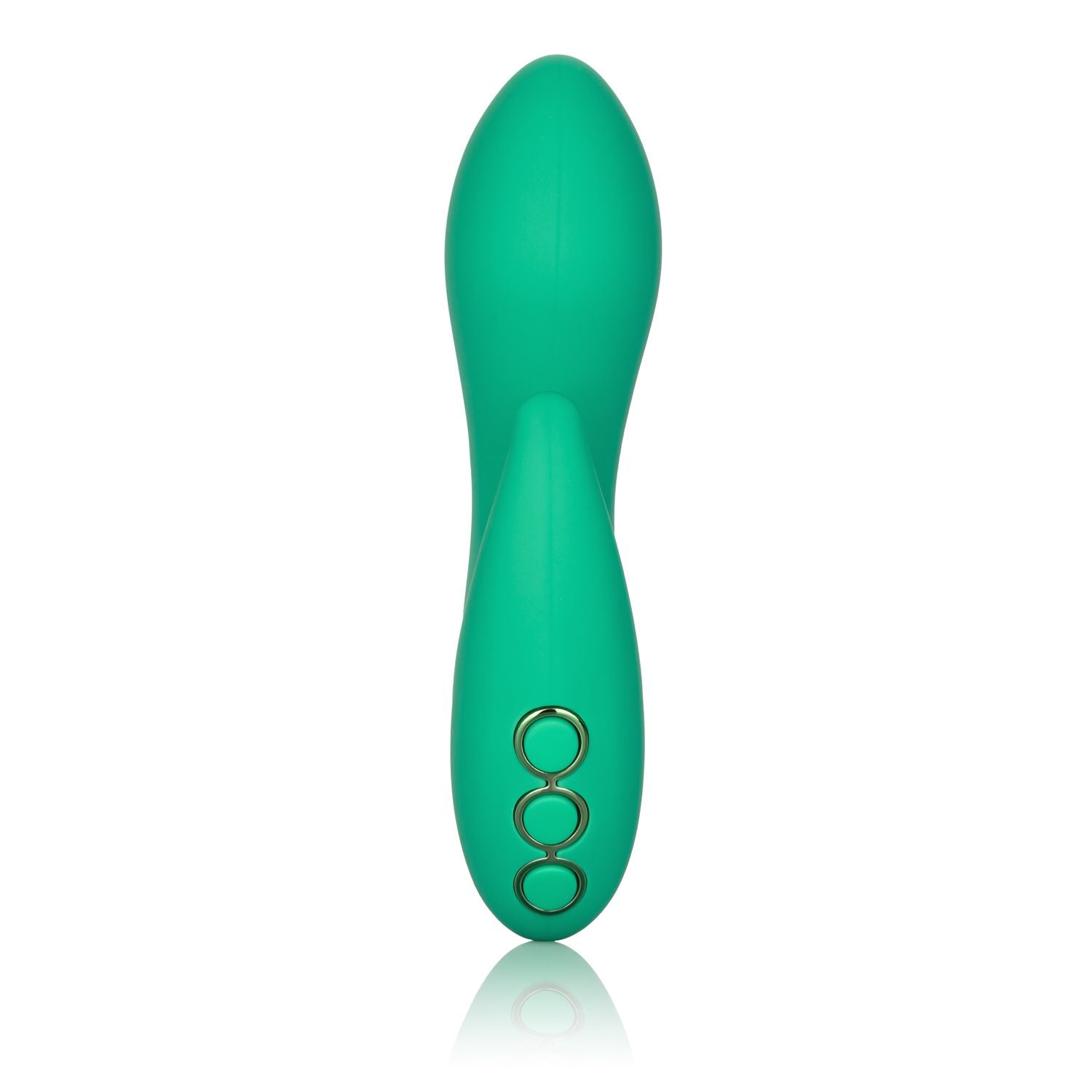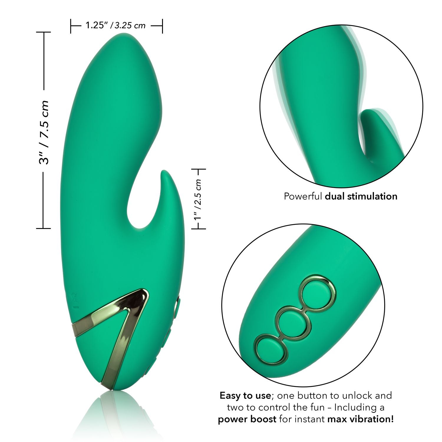 Indulge in waves of pleasure as the California Dreaming(TM) Sierra Sensation moves you in all the right ways. The naughty travel-size rabbit is ready for your next adventure with a flexible teaser, 10 sensational vibration functions and a thrilling Power Boost action .The sensually contoured teaser tip and curved shaft are superb for caressing internal and external pleasure points. For an ultra smooth surface, this curved shape vibe and teaser is covered in a premium silicone with sleek profile buttons. Indulge personalized pleasure with the flexible massager body and 10 vivacious vibration, passionate pulsation and erotic escalation. Indulge in super-charged pleasure with the Power Boost function for intense vibrations. The easy-touch 2-button control lets you cycle through the knee-shaking settings or use the secure travel lock feature to let your passion takes you. Material: Silicone USB rechargeable 90 minute charge time for 210 minute play timeRecharge the premium silicone vibrator in 2.5 hours with the provided USB charging cable to enjoy 45 minutes of high-speed stimulation or 90 minutes of low speed vibrations. Measurements 3" x 1.25" / 7.5cm x 3.25cm (Shaft) 1" x 0.5" / 2.5cm x 1.25cm (Stimulator) One Year Warranty.