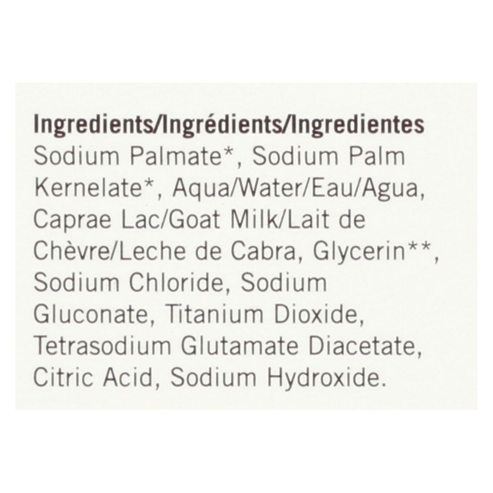 ingredients : sodium palmate;sodium palm kernelate;water;goat milk;glycerin;sodium chloride;sodium gluconate;titanium dioxide;tetrasodium glutamate diacetate;citric acid;sodium hydroxide
