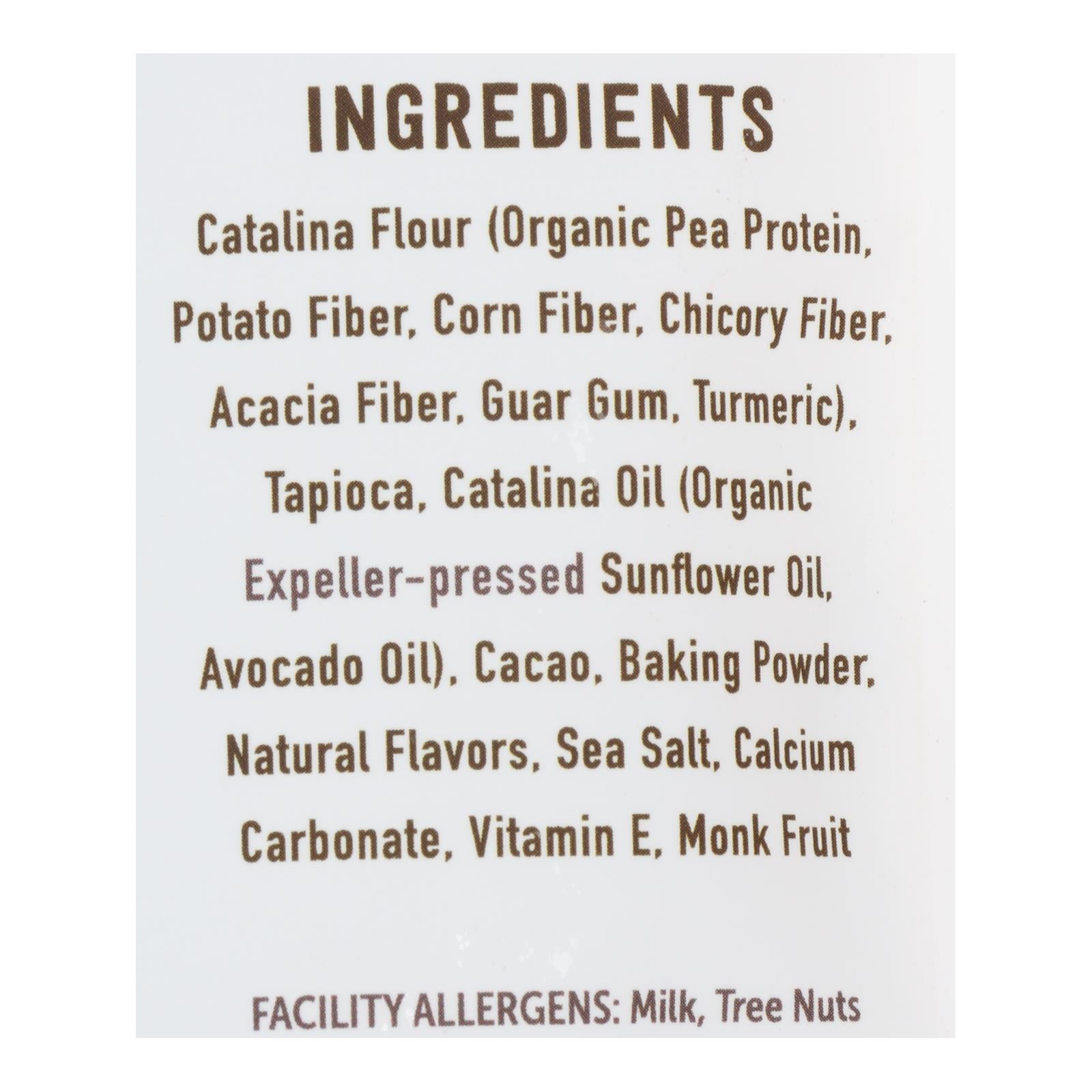 ingredients : catalina flour (pea protein, potato fiber, non-gmo corn fiber, chicory root fiber, guar gum);tapioca flour;high oleic sunflower oil;cocoa powder;baking powder;natural flavors;sea salt;calcium carbonate;stevia extract;monk fruit extract