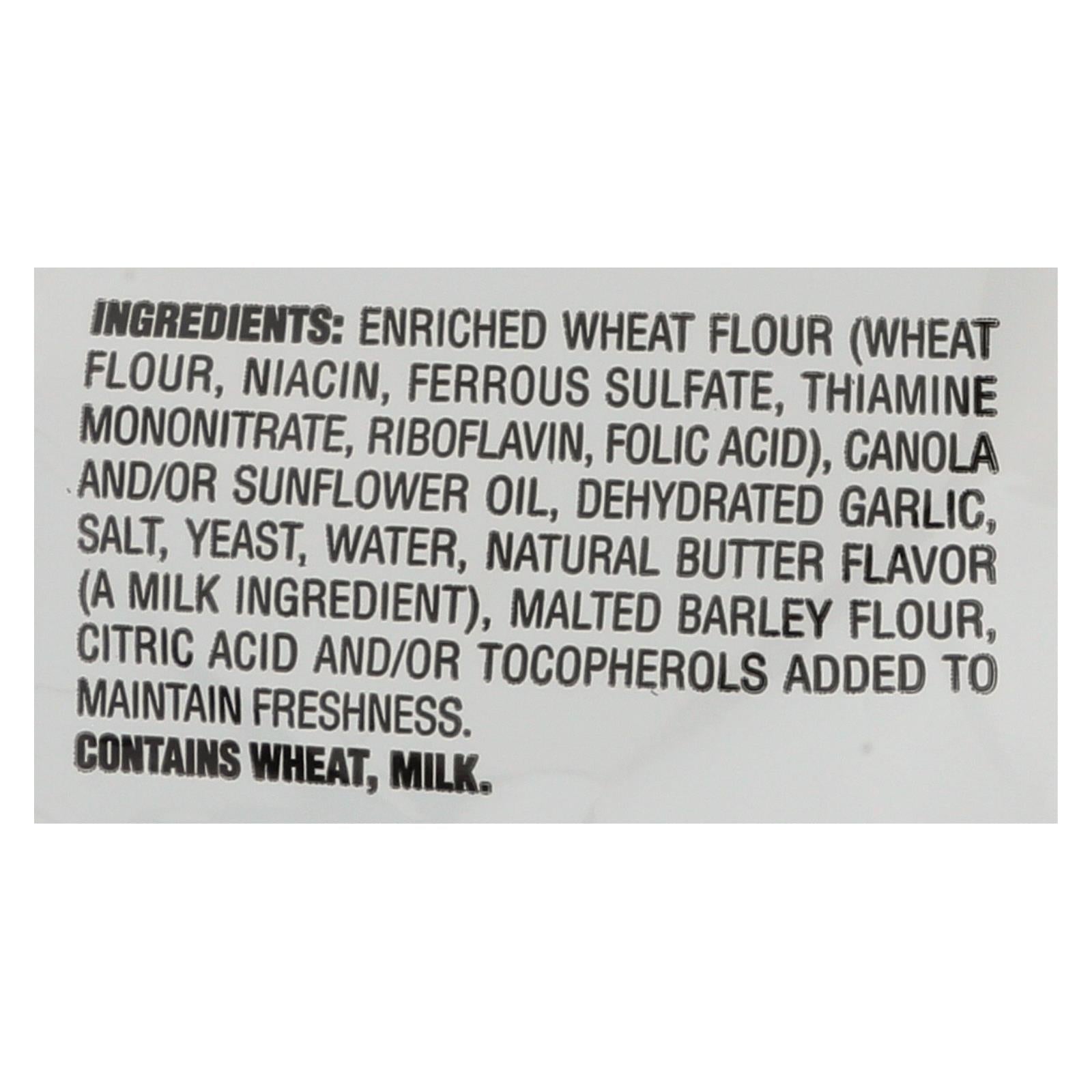 ingredients : enriched wheat flour (wheat flour, niacin, ferrous sulfate, thiamine mononitrate, riboflavin, folic acid);canola and/or sunflower oil;dehydrated garlic;salt;yeast;water;natural butter flavor (a milk ingredient);malted barley flour;citric acid and/or tocopherols added to maintain freshness