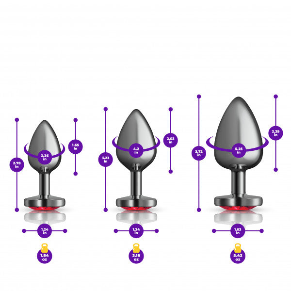 Cheeky Charms is a collection of vibrant, seductive metal anal plugs, each showcasing a beautiful acrylic gemstone. This anal trainer kit includes a small, medium and large butt plug. Tapered for easy insertion and designed with a flared base and thin stem, Cheeky Charms Anal Trainer Kit makes it easy to prepare for anal sex or to achieve a fuller feeling during intercourse. Start with your small anal plug and gradually train up to the medium and large plugs depending on comfort and experience level. These butt plugs are great for temperature play and anyone who wants to decorate their rear entrance. Available in various unique colors, Cheeky Charms are the perfect booty jewelry for women, men, couples and also for solo play.