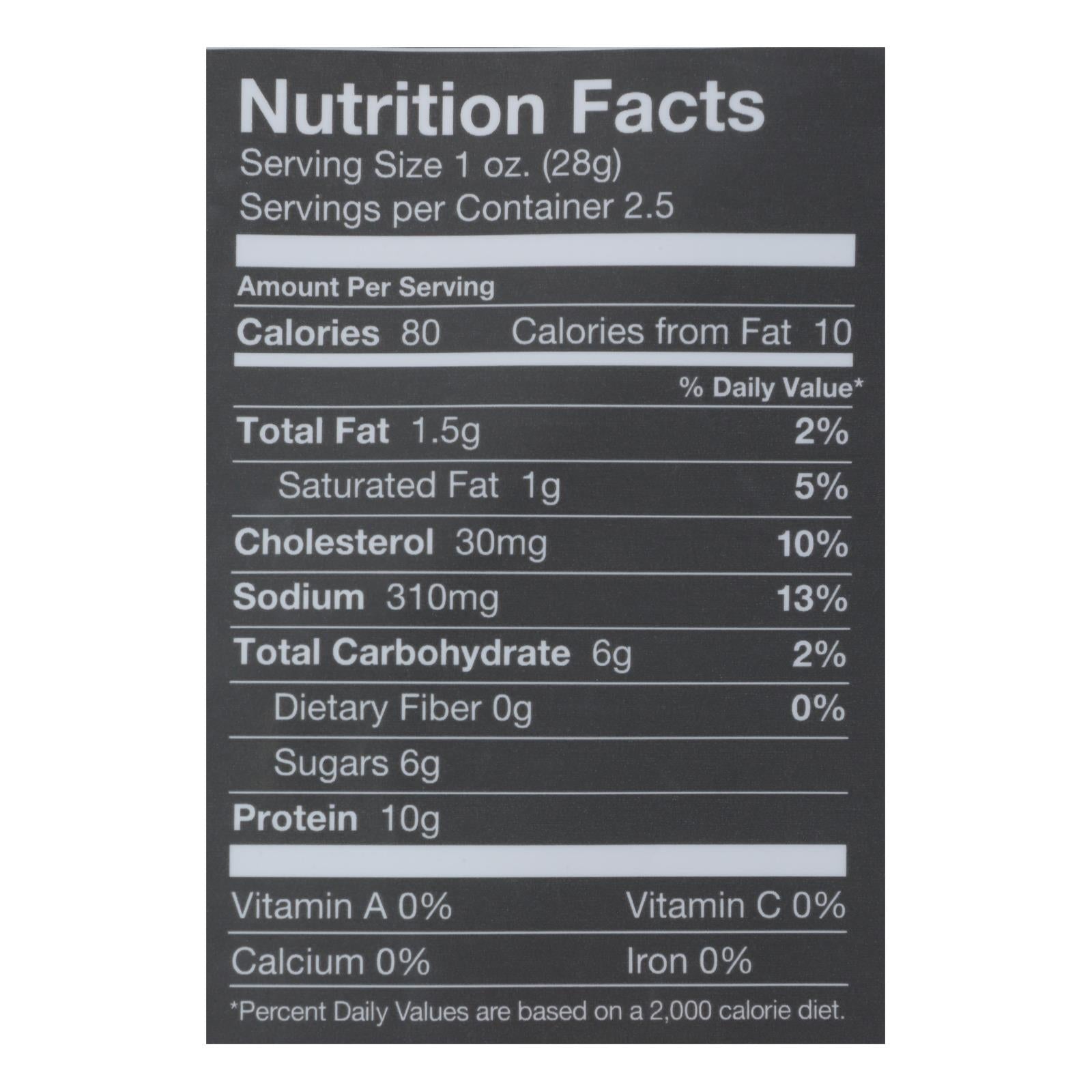 Chef's cut real jerky, real chicken jerky honey barbecue is made from real chicken breast. This product is chef crafted, made from premium cuts and free of gluten and added nitrites. Chef's cut real jerky, real chicken jerky honey barbecue is great as an on-the-go snack in a 2.5 oz. Pouch and contains only 80 calories per 1 oz. Serving. This product is also a good source of protein, containing 10 g. Per serving. Please see nutritional fact panel for any possible allergens associated with chef's cut real jerky, real chicken jerky honey barbecue.