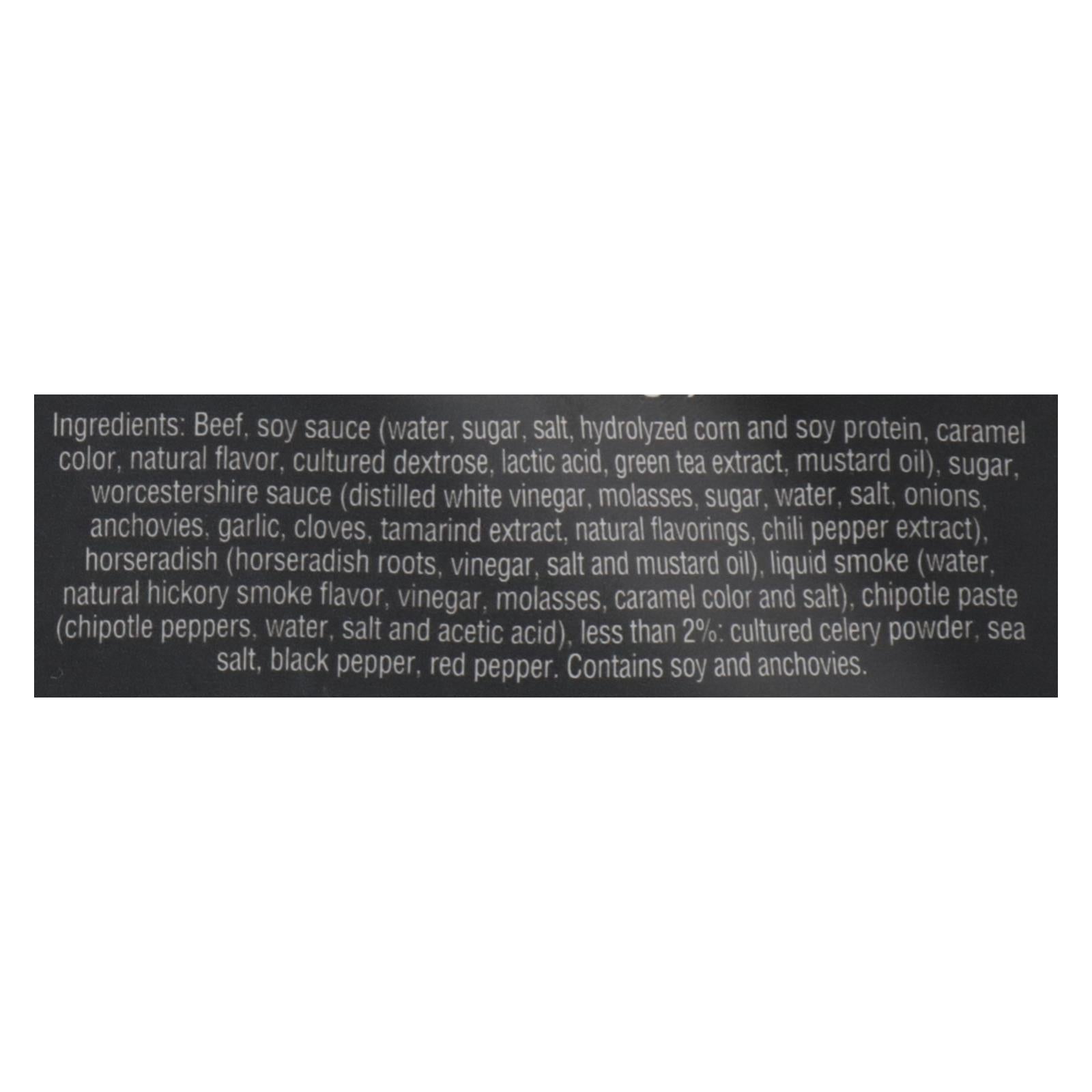 Chef's cut real jerky, real jerky, steak chipotle pepper is made from premium beef. This product is chef crafted, made from premium cuts and free of gluten and added nitrites. Chef's cut real jerky, real jerky, steak chipotle pepper is great as an on-the-go snack in a 2.5 oz. Pouch and contains only 100 calories per 1 oz. Serving. This product is also a good source of protein, containing 12 g. Per serving. Please see nutritional fact panel for any possible allergens associated with chef's cut real jerky, real jerky, steak chipotle pepper.