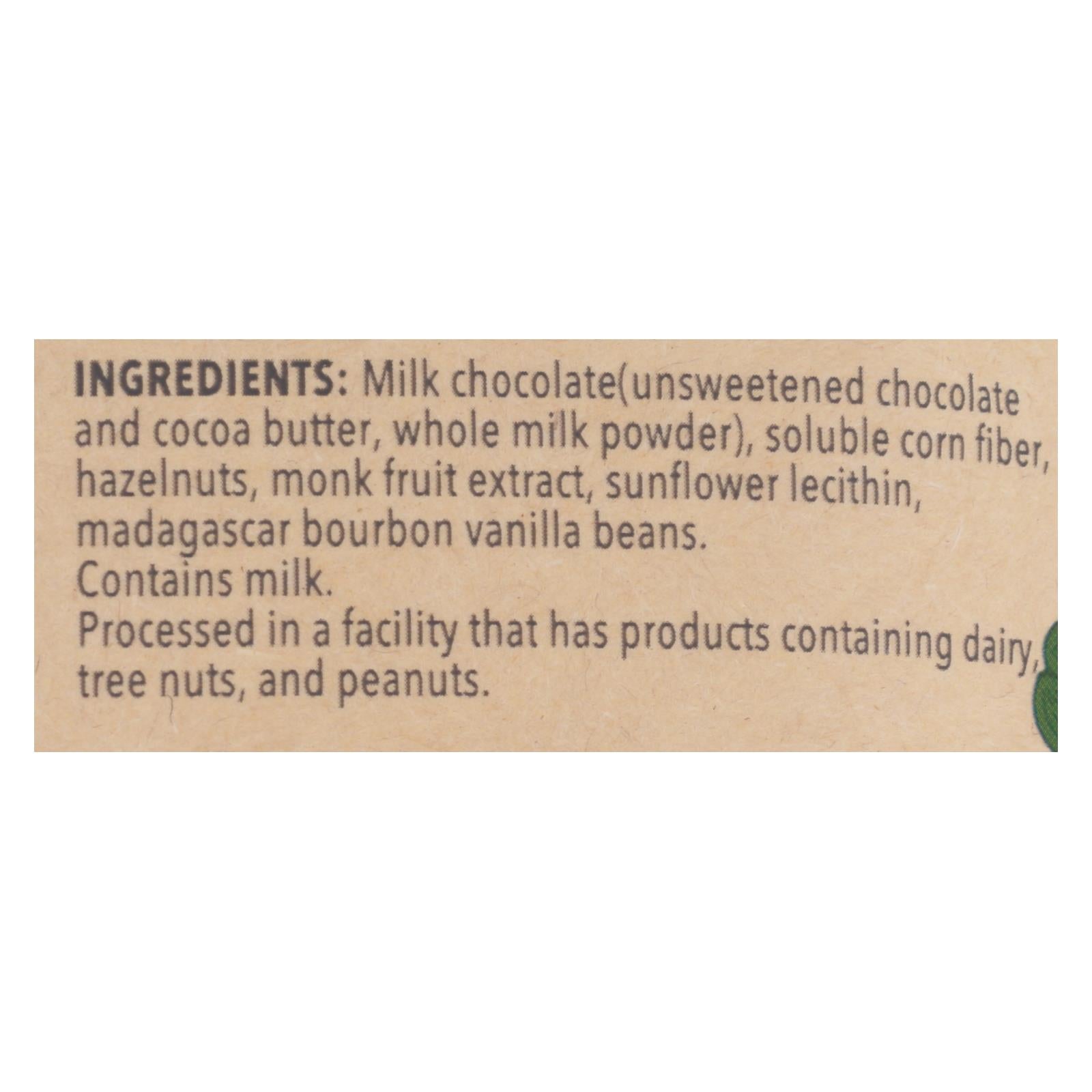 ingredients : milk chocolate confection (chocolate liquor, cocoa butter, whole milk powder);non-gmo resistant dextrin;roasted hazelnuts;sunflower lecithin;monk fruit extract;natural caramel flavor;madagascar bourbon vanilla beans