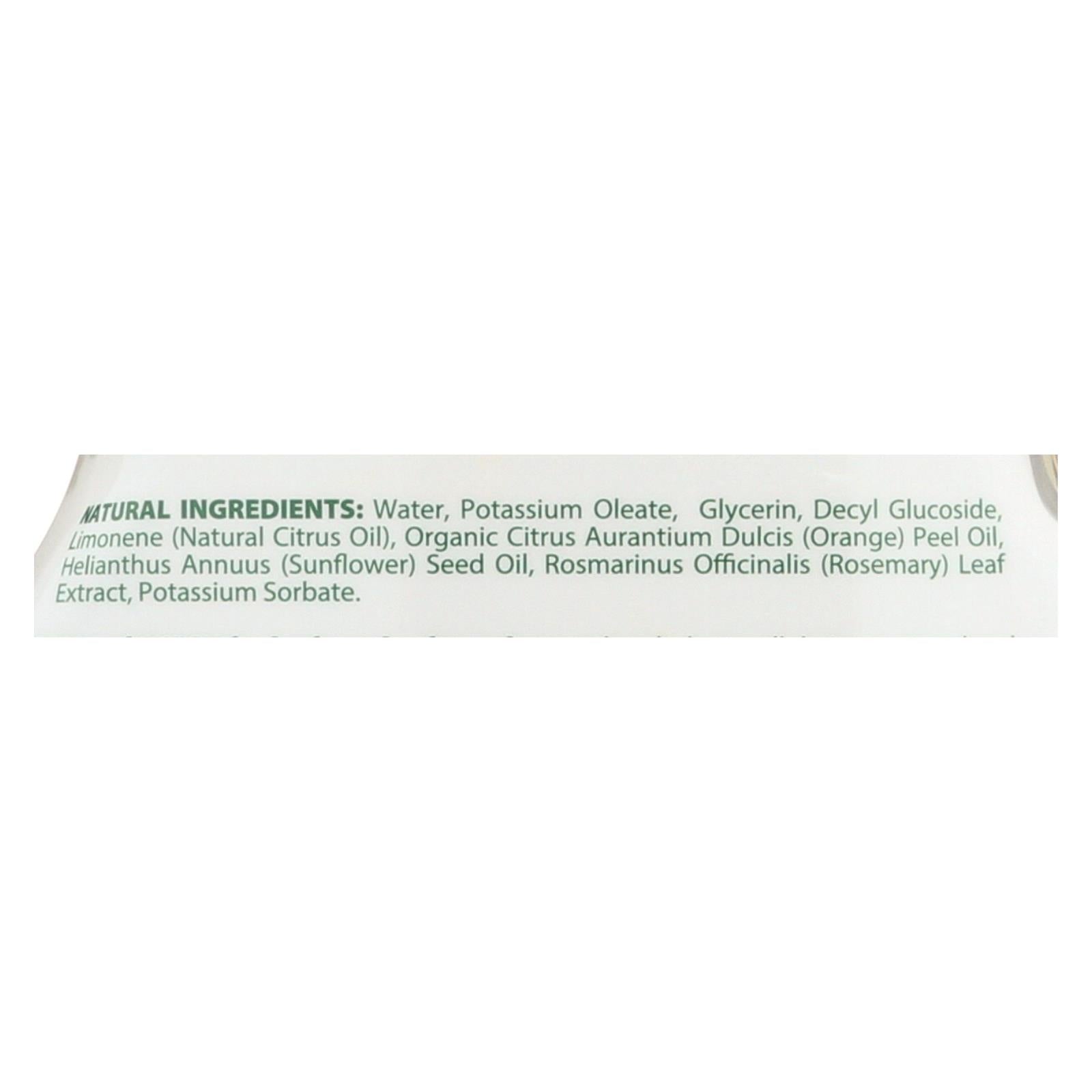 ingredients : water;potassium oleate;glycerin;decyl glucoside;limonene;natural citrus oil;organic citrus aurantium dulcis;orange;peel oil;helianthus annuus;sunflower;seed oil;rosmarinus officinalis;rosemary;leaf extract;potassium sorbate
