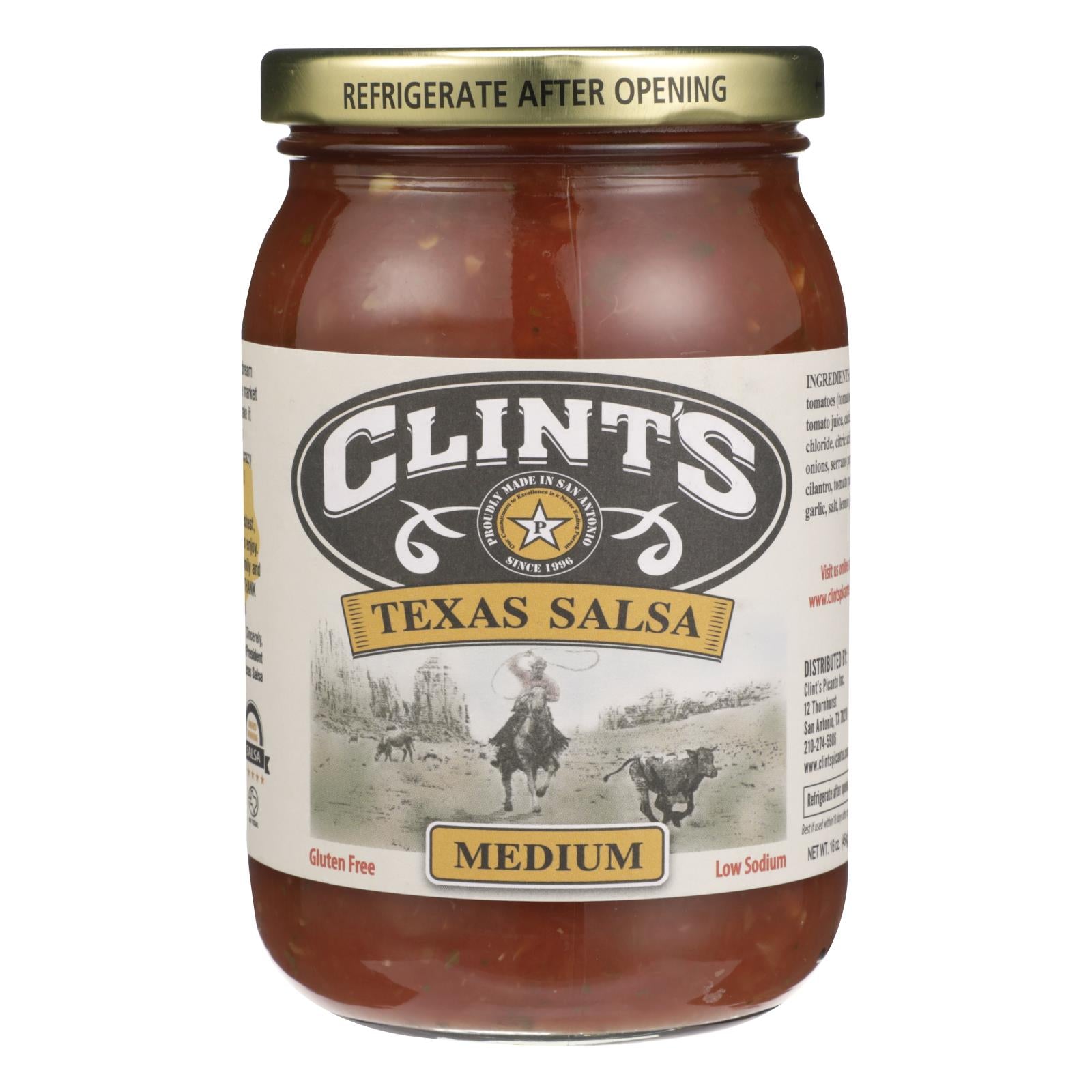 Clint's medium texas salsa contains a blend of tomatoes, serrano peppers, cilantro, lemon juice and other seasonings that create e a flavorful salsa with a fresh taste. Our recipe has only 5 calories per serving and 0 g. Of fat, so you can enjoy it as a dip, marinade or side dish without straying from your healthy diet. This jar contains 16 oz. Of salsa that's made with all natural ingredients.