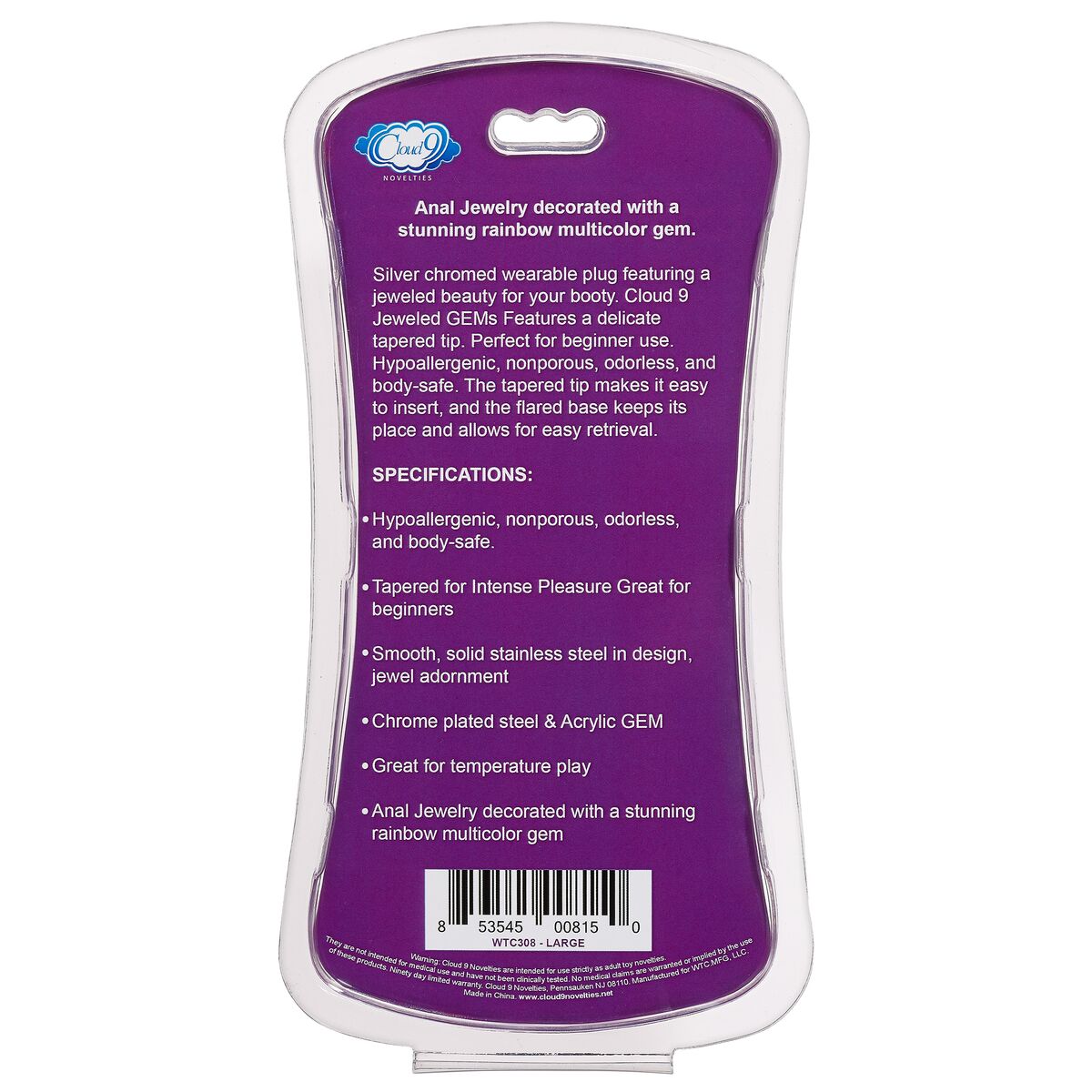 Cloud 9 Gems Silver Chrome Tall Anal Plug Large. New Gems Silver Chromed Anal Plug Tall Tapered Design. Plug with anal jewelry decorated with a stunning rainbow multicolored gem. Hypoallergenic, nonporous, odorless and body safe. Tapered for intense pleasure. Great for beginners. Anal Jewelry decorated with a stunning rainbow multicolor gem. Silver chromed wearable plug featuring a jeweled beauty for your booty. Cloud 9 Jeweled Gems.