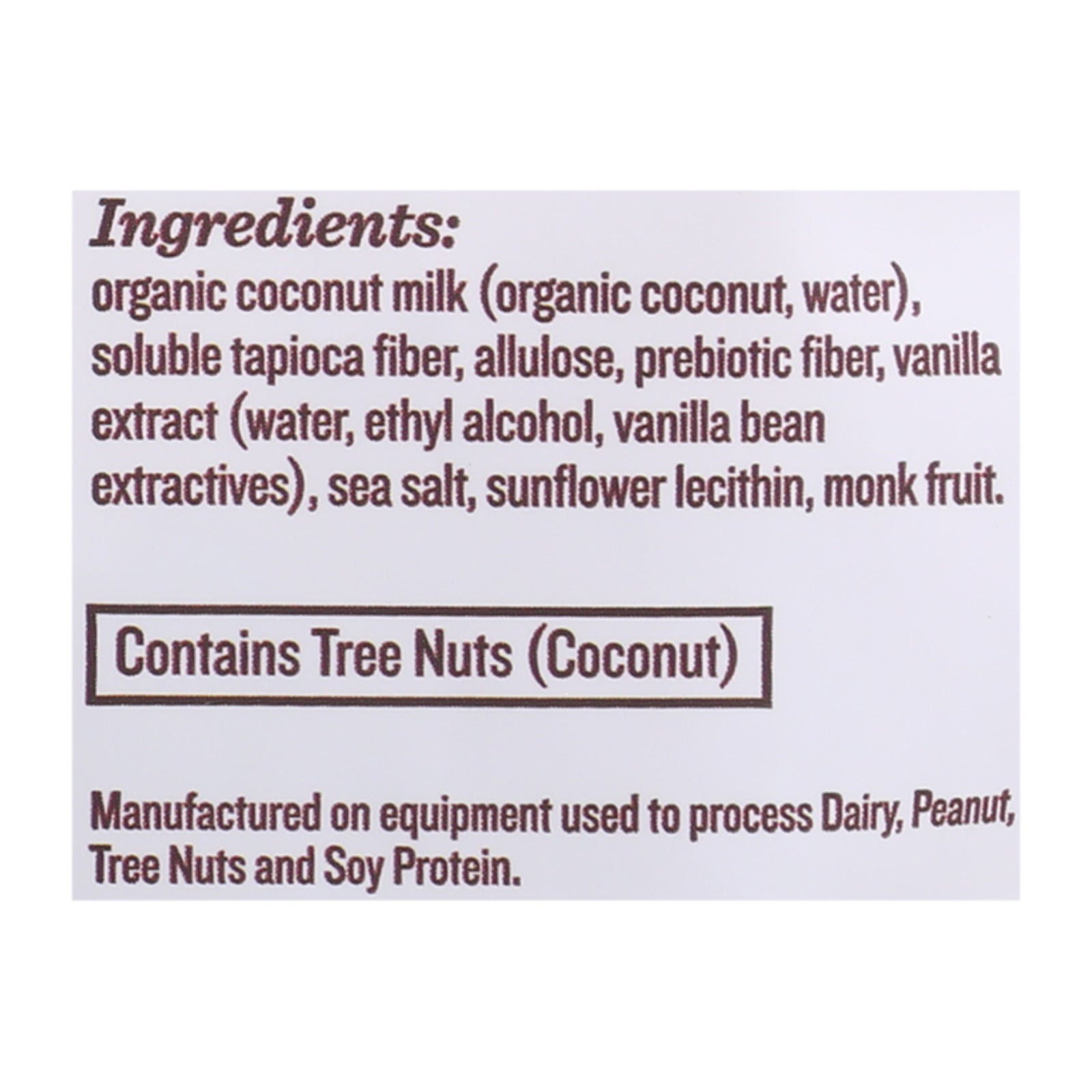 ingredients : organic coconut milk (organic coconut, water);soluble tapioca fiber;allulose;prebiotic fiber;vanilla extract (water, ethyl alcohol, vanilla bean extractives);sea salt;sunflower lecithin;monk fruit;natural flavors