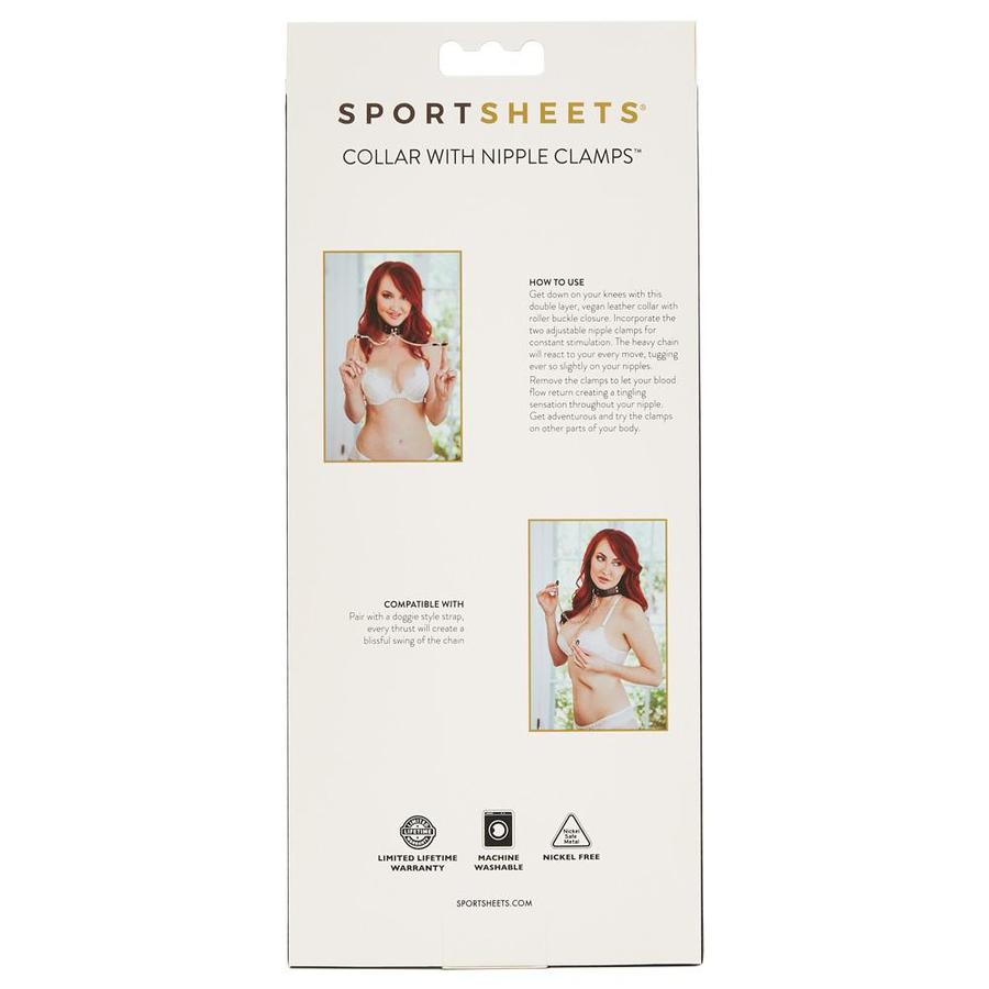 The Sportsheets Collar with Nipple Clamps. Gorgeous, vegan leather collar with attached nipple clamps provides constant stimulation. Soft, double-layered, hand-stitched, PVC collar adjusts with a quality, roller buckle closure. The two coated nipple clamps have tension adjustments and are attached to the collar with 10.5" chains. Perfect for nipple stimulation and many other sensitive areas. Nickel-free.