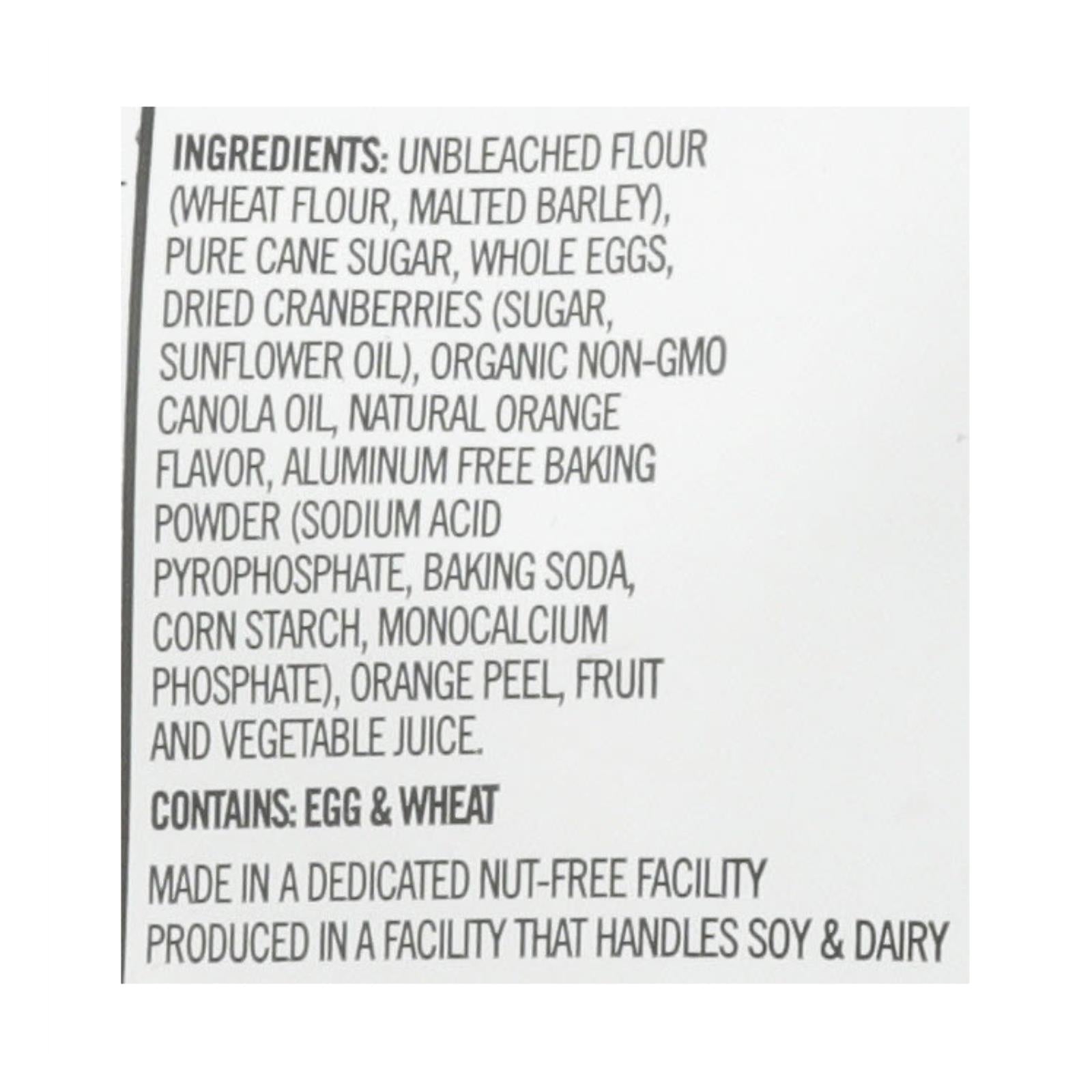 ingredients : unbleached flour (wheat flour, malted barley);pure cane sugar;whole eggs;dried cranberries (cranberries, cane sugar, sunflower oil);organic non-gmo canola oil;natural orange flavor;aluminum-free baking powder (sodium acid pyrophosphate, baking soda, corn starch, monocalcium phosphate);orange peel;fruit and vegetable juice