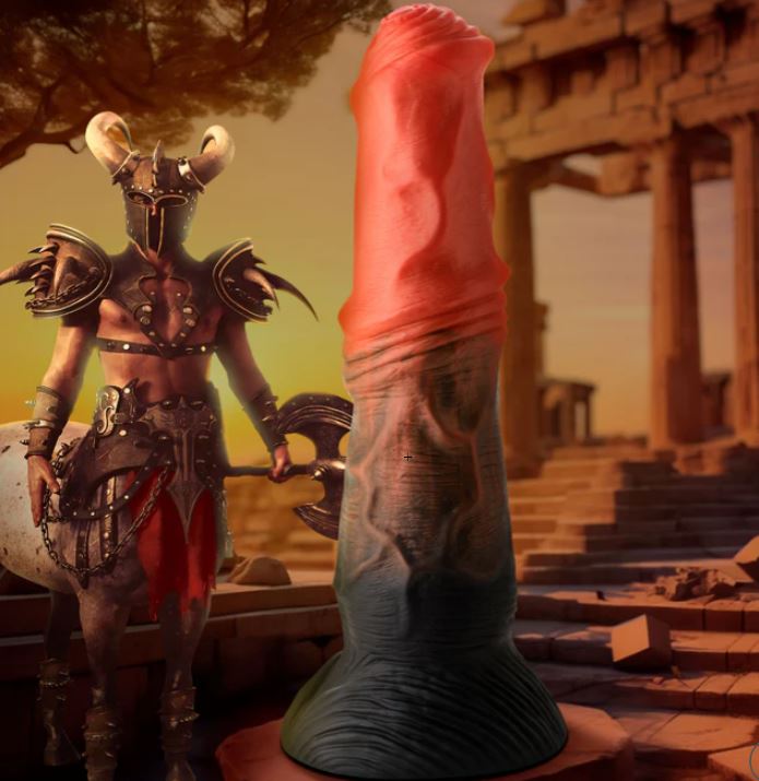 Get ready to ride with this Centaur dildo! This thick, long, horse-like rod is orange, copper and black. At the tip of the wide head are rings of foreskin that come together at a point to create a ridge along the shaft. At the center are wrinkled ribs where the skin bunches up along the massive length of this schlong. This meaty dildo has a girthy, long body that will stretch your limits! Made out of premium, flexible, phthalate-free silicone, this dong is body-safe and best used with water-based lubricants only. Enjoy hands free rides due to the strong suction cup base! Invite a partner to indulge in kinky cosplay or fantasy roleplay and use their favorite harness to transform this dong into a strapon! Afterward, make sure to wash it with warm water and mild soap, then spray it with a toy cleaner and air-dry. Keep out of direct sunlight and heat.