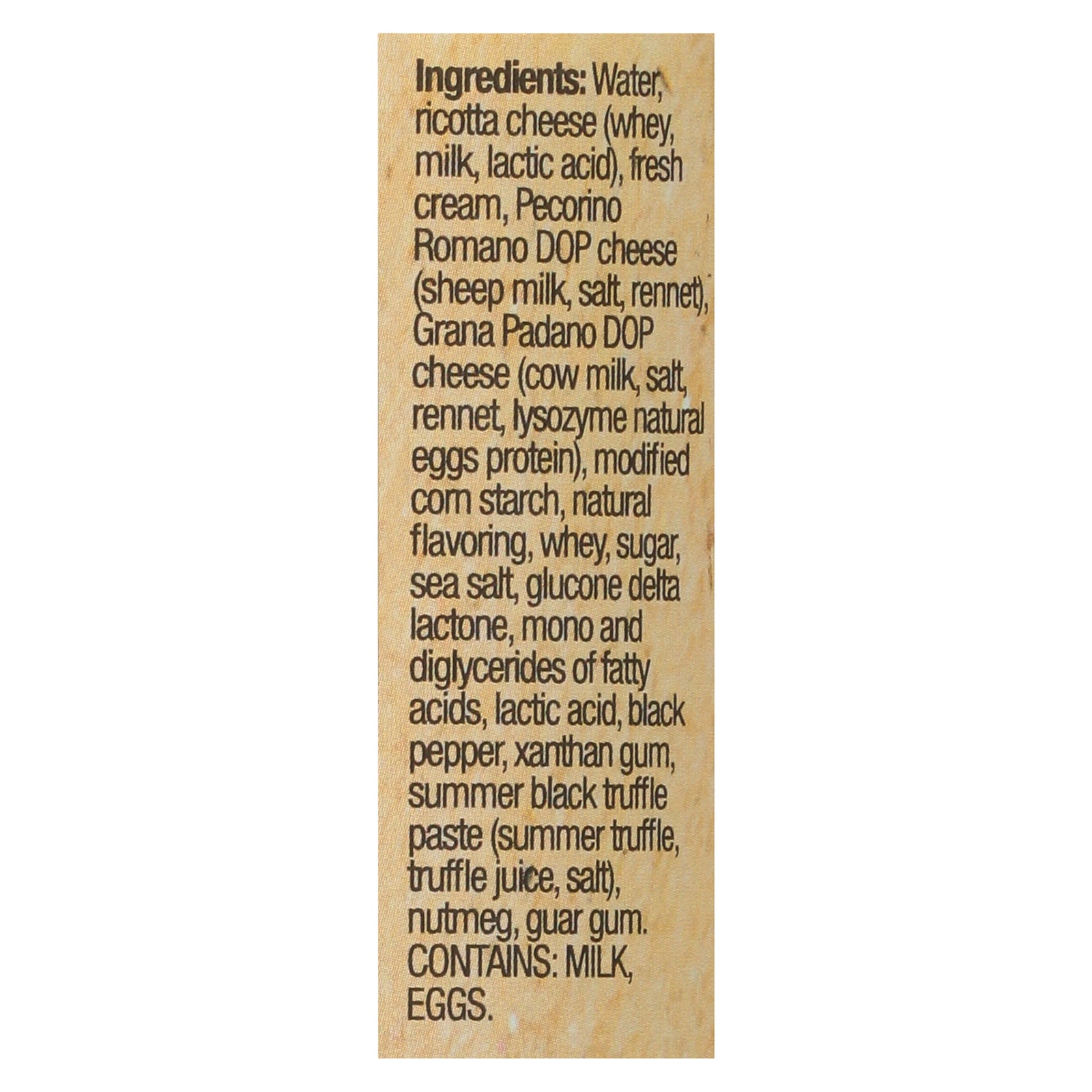 ingredients : water;ricotta cheese (whey, milk, lactic acid);fresh cream;pecorino romano dop cheese (sheep milk, salt, rennet);grana padano dop cheese (cow milk, salt, rennet, lysozyme natural eggs protein);modified corn starch;natural flavoring;whey;sugar;sea salt;glucone delta lactone;mono and diglycerides of fatty acids;lactic acid;black pepper;xanthan gum;summer black truffle paste (summer truffle, truffle juice, salt);nutmeg;guar gum
