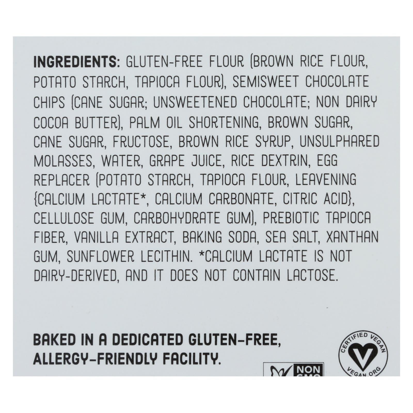 ingredients : gluten-free flour (brown rice flour, potato starch, tapioca flour);semi-sweet chocolate chips (cane sugar, unsweetened chocolate, cocoa butter);palm oil;brown sugar;cane sugar;fructose;brown rice syrup;water;egg replacer (potato starch, tapioca flour, leavening [calcium lactate*, calcium carbonate, cream of tartar], cellulose gum, modified cellulose);molasses;prebiotic from non-gmo tapioca starch;vanilla extract;grape juice;rice syrup;baking soda;salt;xanthan gum;sunflower lecithin