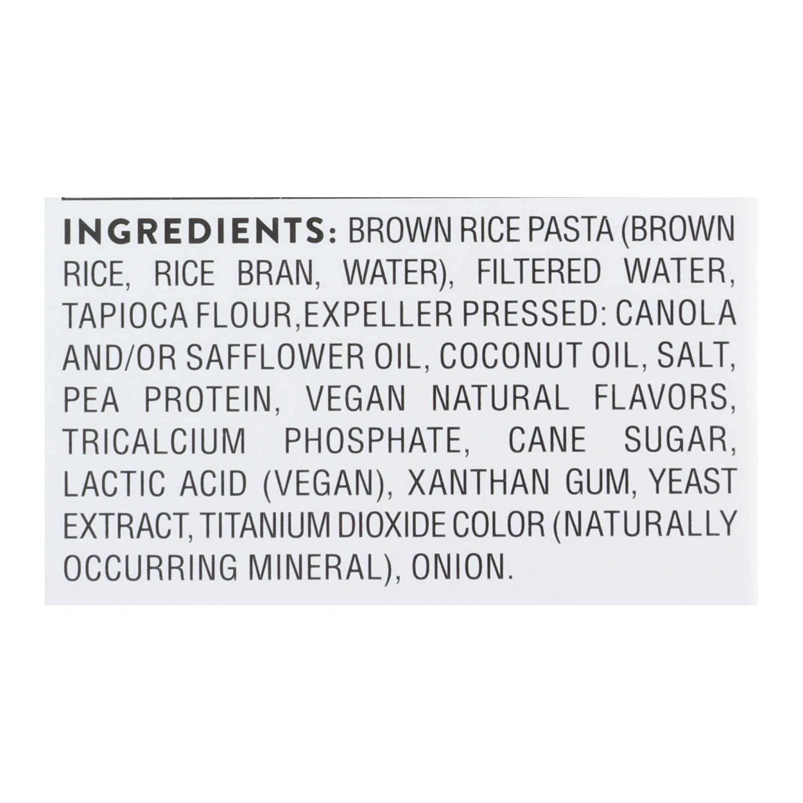 ingredients : brown rice pasta (brown rice, rice bran);filtered water;tapioca flour;expeller pressed safflower oil;coconut oil;salt;natural flavors;pea protein;tricalcium phosphate;cane sugar;lactic acid;yeast extract;xanthan gum;onion