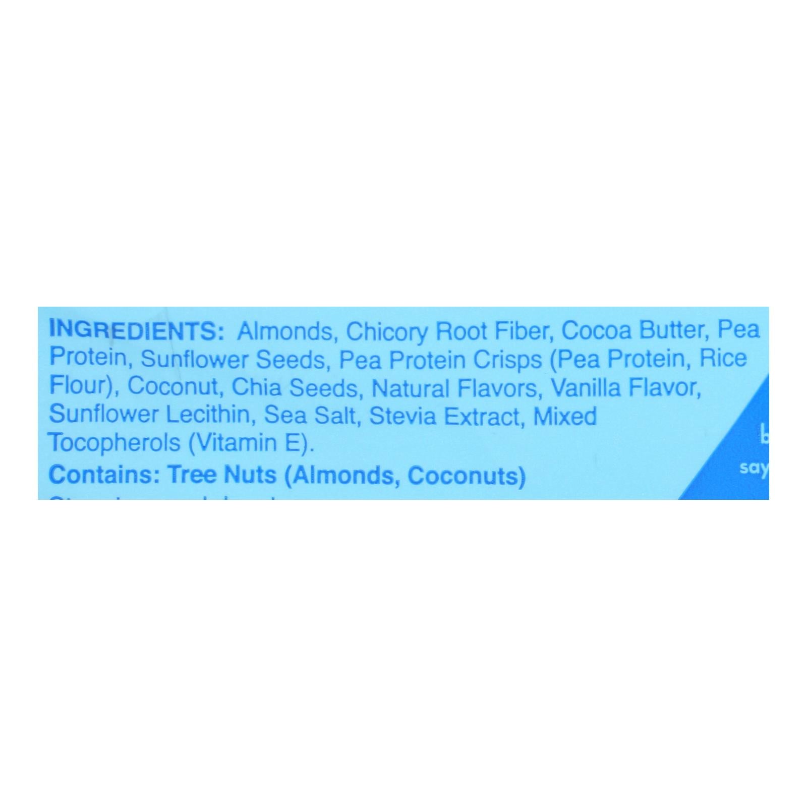 ingredients : almonds;chicory root fiber;cocoa butter;pea protein crisps;pea protein;rice flour;calcium carbonate;sunflower seeds;coconut;natural flavors;chia seeds;vanilla flavor;sunflower lecithin;sea salt;stevia extract;mixed tocopherols;vitamine