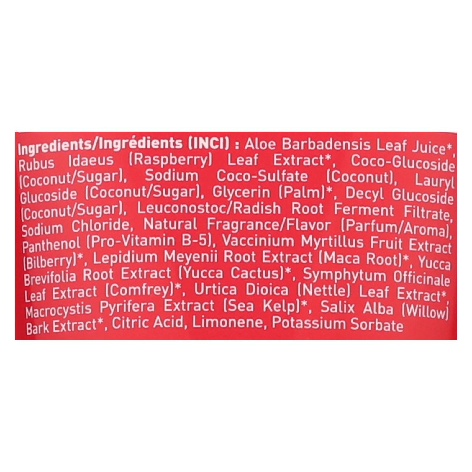 ingredients : aloe barbadensis leaf juice;rubus idaeus;raspberry;leaf extract;coco-glucoside;coconut/sugar;sodium coco-sulfate;coconut;lauryl glucoside;glycerin;palm;decyl glucoside;leuconostoc/radish root ferment filtrate;sodium chloride;natural fragrance/flavor;parfum/aroma;panthenol;pro-vitamin b-5;vaccinium myrtillus fruit extract;bilberry;lepidium meyenii root extract;maca root;yucca brevifolia root extract;yucca cactus;symphytum officinale leaf extract;comfrey;urtica dioica;nettle;macrocystis pyrifera e
