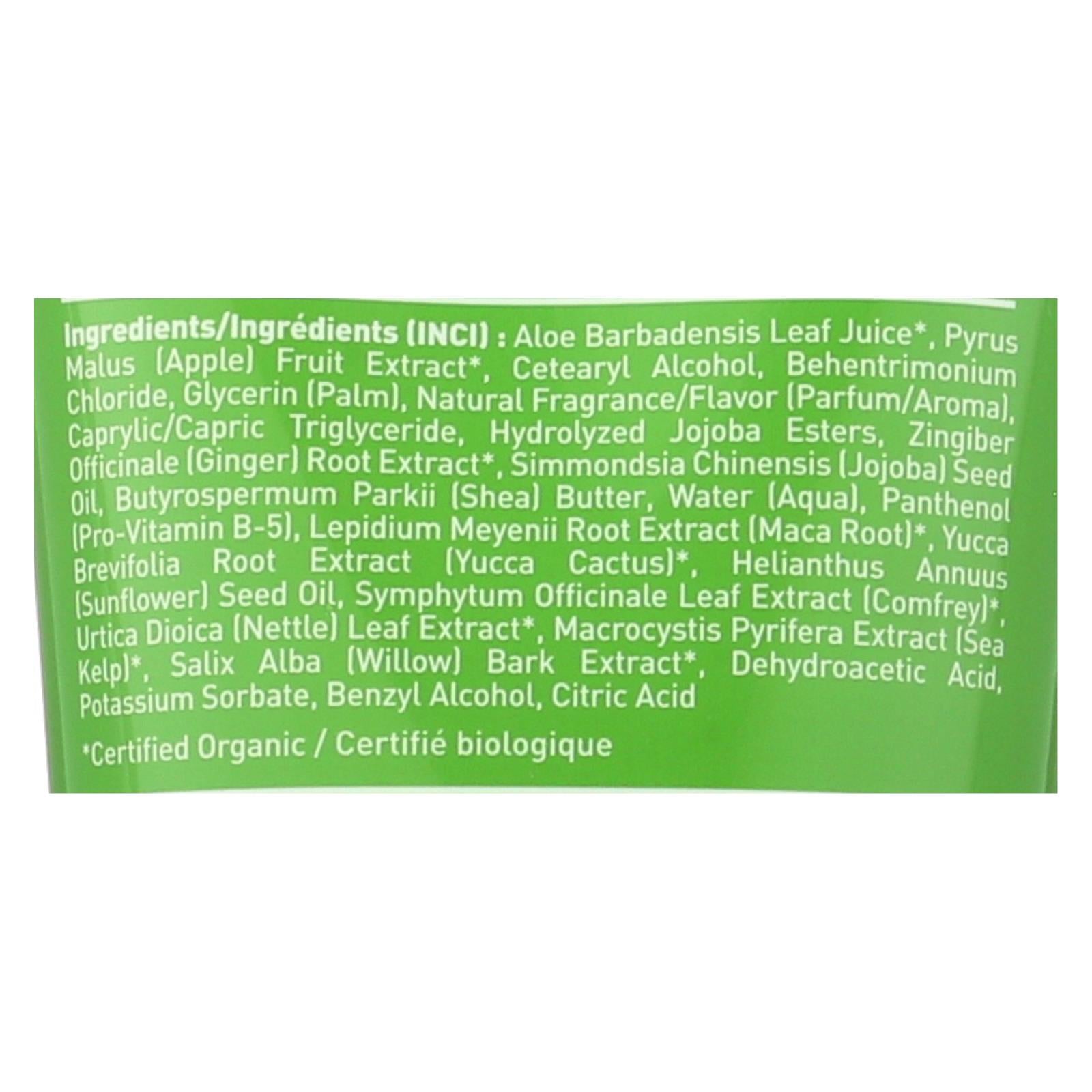 ingredients : inci;: aloe barbadensis leaf juice;pyrus malus;apple;fruit extract;cetearyl alcohol;behentrimonium chloride;glycerin;palm;natural fragrance/flavor;aroma;caprylic/capric triglyceride;hydrolyzed jojoba esters;zingiber officinale;ginger;root extract;simmondsia chinensis;jojoba;seed oil;butyrospermum parkii;shea;butter;water;aqua;panthenol;pro-vitamin b-5;lepidium meyenii root extract;maca root;yucca brevifolia root extract;yucca cactus;helianthus annuus;sunflower;symphytum officinale leaf extract;c