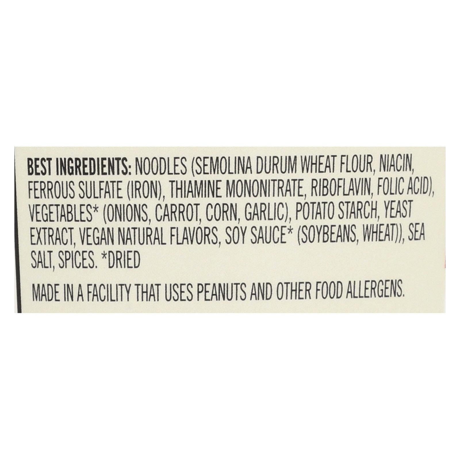 ingredients : best noodles;semolina durum wheat flour;niacin;ferrous sulfate;iron;thiamine mononitrate;riboflavin;folic acid;vegetables;onions;carrot;corn;garlic;potato starch;yeast extract;vegan natural flavors;soy sauce;soybeans;wheat;sea ‘salt;spices