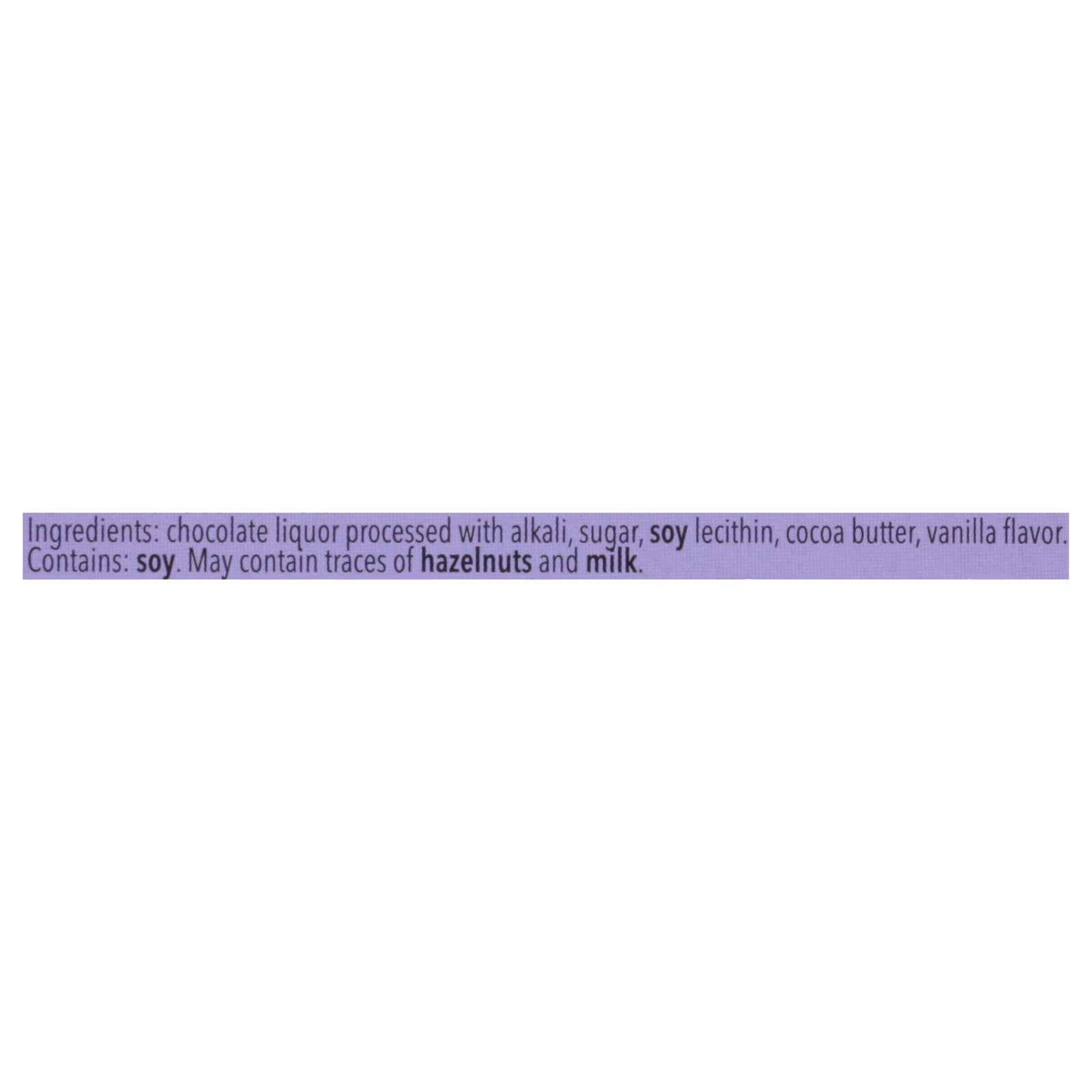ingredients : chocolate liquor processed with alkali;sugar;soy lecithin;cocoa butter;vanilla flavor