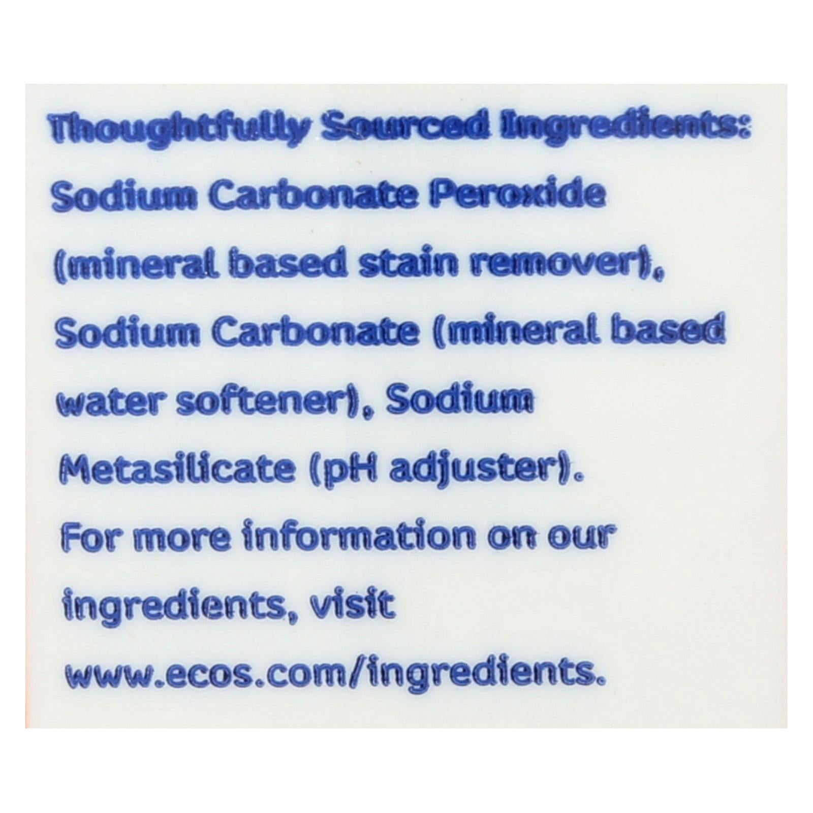 Ecos oxo-brite multi-purpose stain remover, laundry & household use is extraordinarily effective and concentrated with mineral based power. Each scoop gives you extra-strength cleaning that's safer for your family with no phosphates, no chlorine and no bleach. This product has hundreds of uses including carpet stains and odors, upholstery, grout, calcium buildup, decks, outdoor furniture, bathroom surfaces and pet messes. This oxygen cleaner comes in a 3.6 lb. Tub. See the facts label for warnings and allergens.