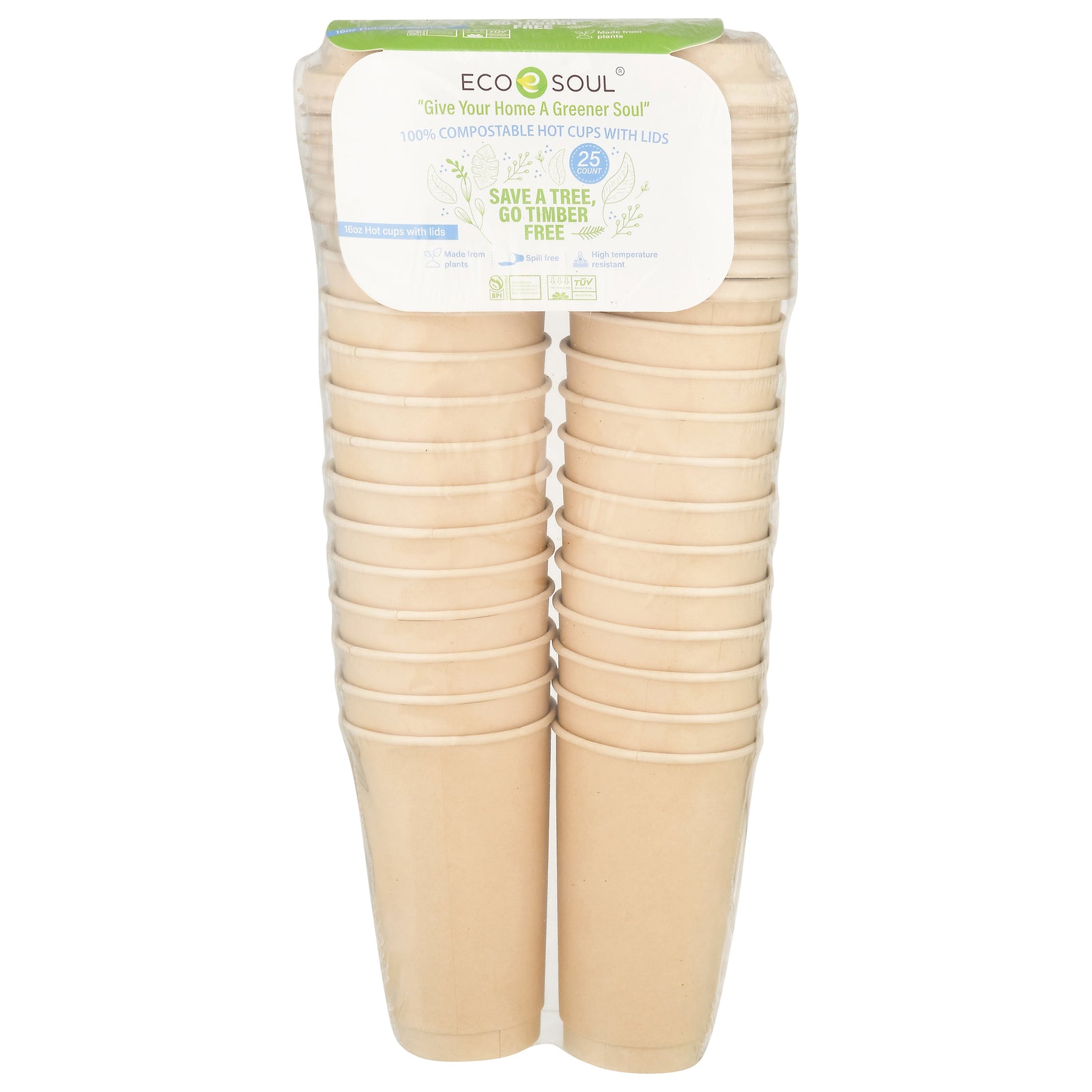 Give your home a greener soul. 100% compostable hot cups with lids. 16oz hot cups with lids. Save a tree go timer free. Spill free. High temperature resistant. Made from plants. Leak resistant. Sturdy. Recyclable packaging. Bpi compostable commercially compostable only. Facilities may not exist in your area. Ok compost. Tuv austria industrial.
