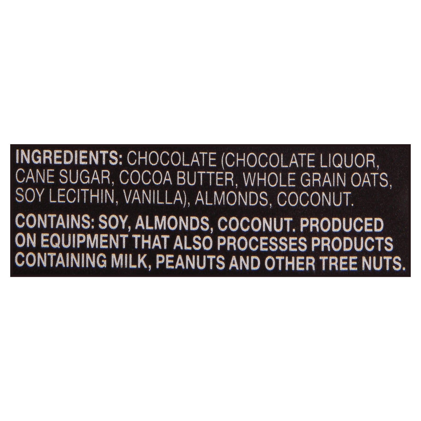 ingredients : chocolate (chocolate liquor, cane sugar, cocoa butter, whole grain oats, soy lecithin, vanilla);almonds;coconut