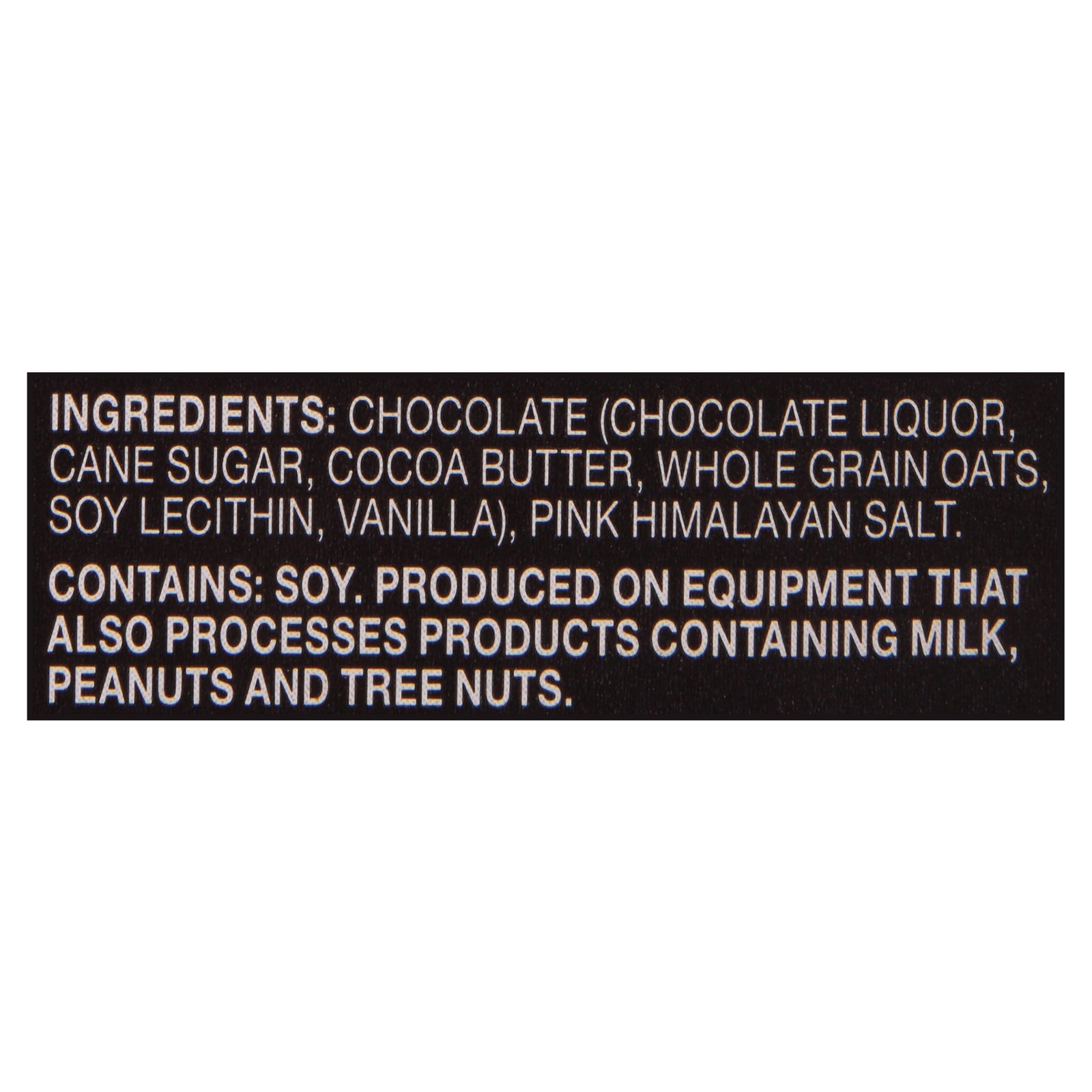 ingredients : chocolate (chocolate liquor, cane sugar, cocoa butter, whole grain oats, soy lecithin, vanilla);pink himalayan salt