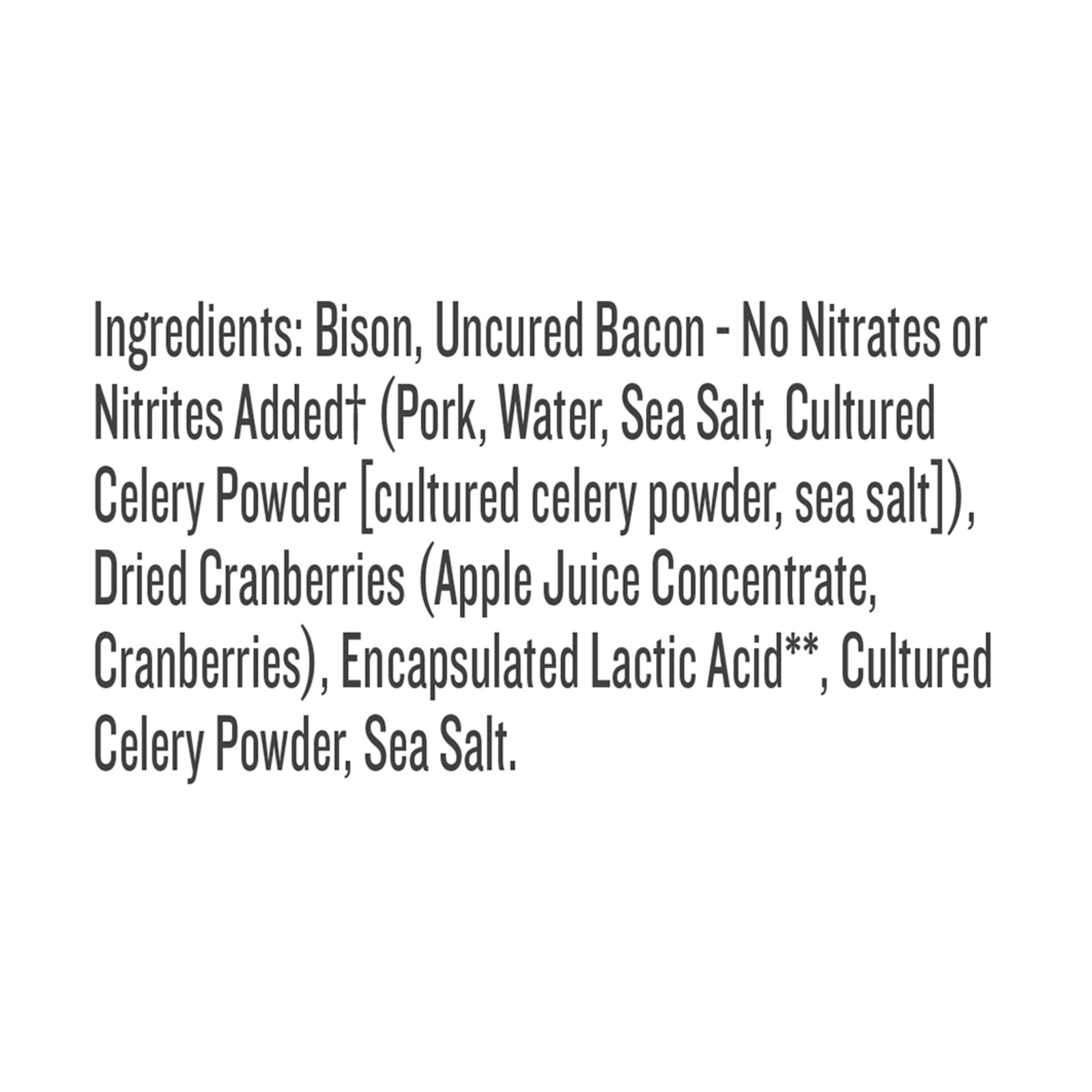ingredients : bison;uncured bacon - no nitrates or nitrites added† (pork, water, sea salt, brown sugar, vinegar, celery powder);dried cranberries (apple juice concentrate, cranberries);encapsulated lactic acid;cultured celery powder;sea salt