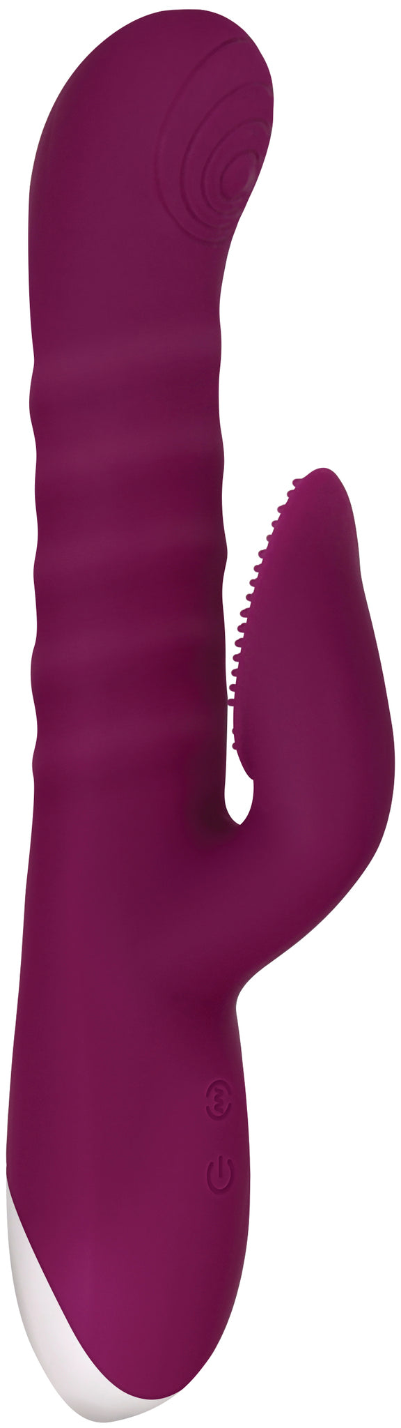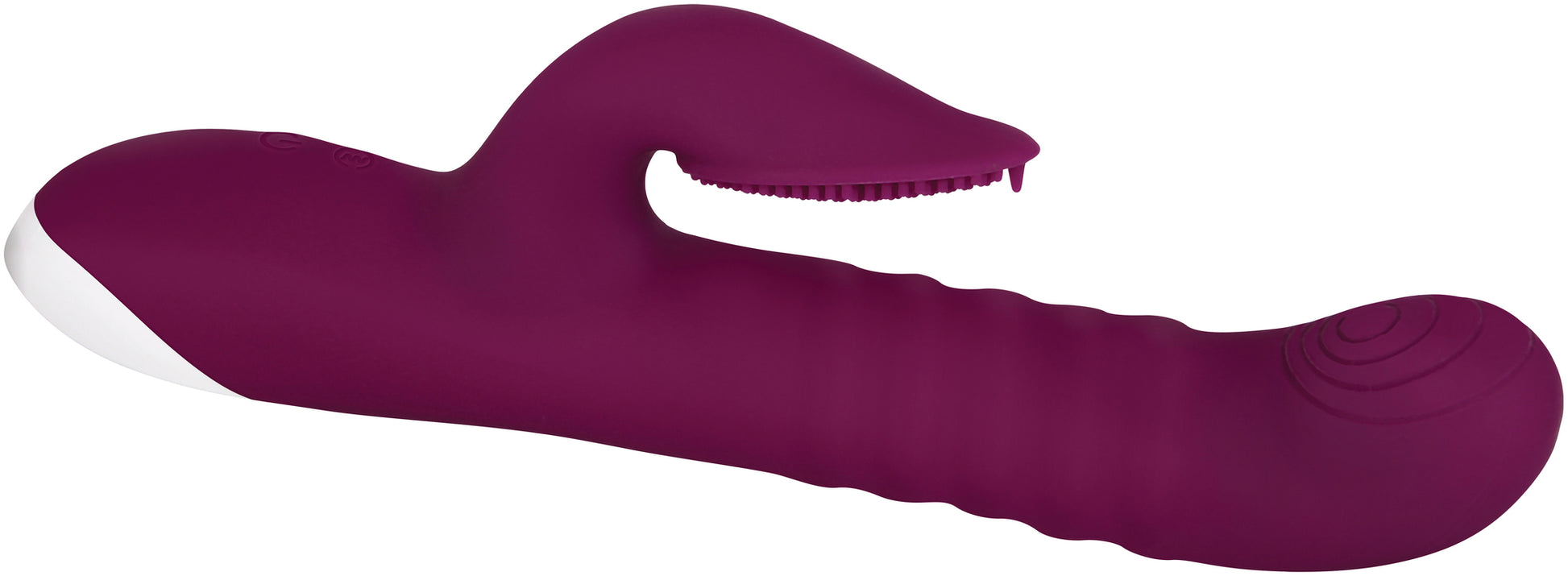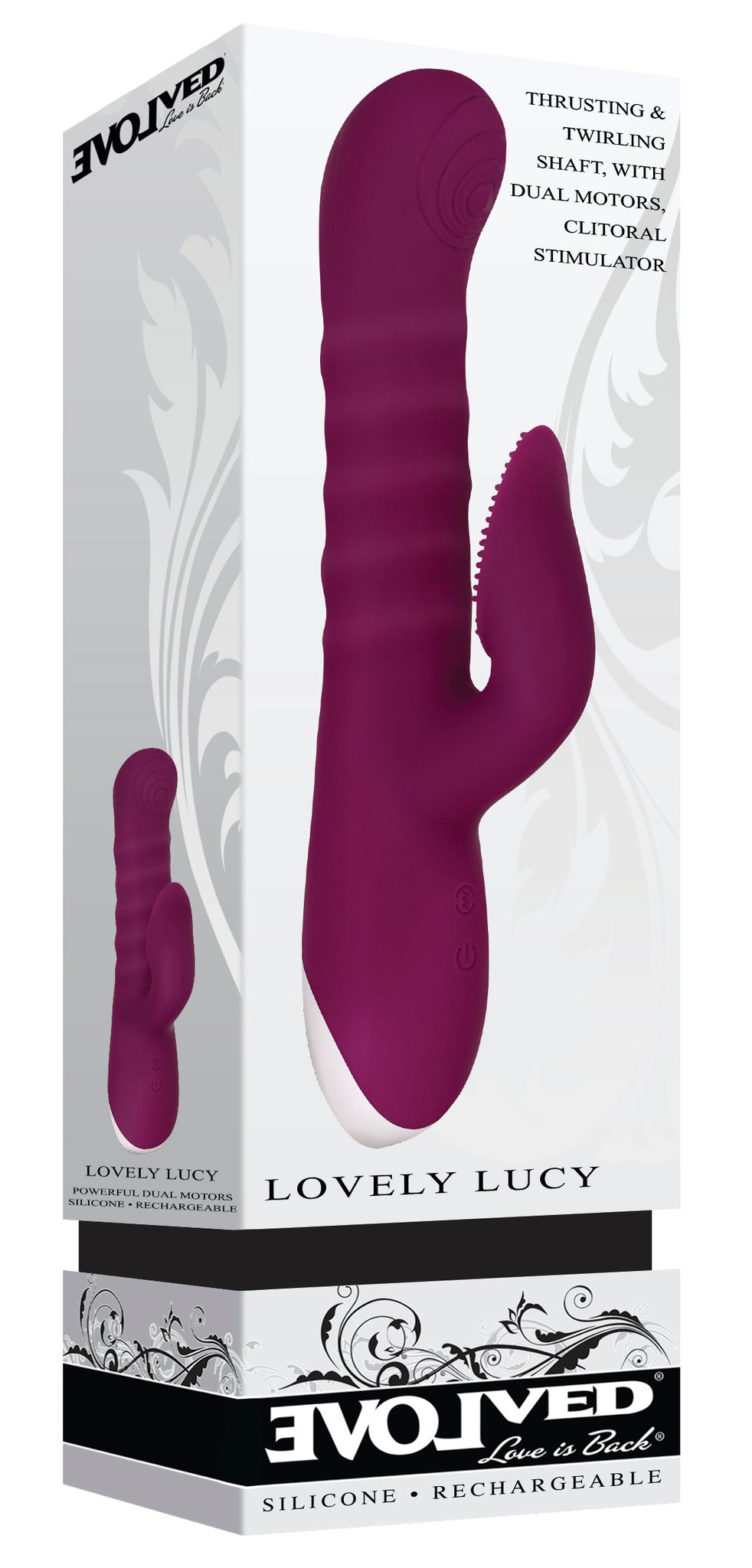 Lovely Lucy Rechargable Vibrator from Evolved Novelties. Satisfy multiple pleasure cravings at once! Two powerful motors deliver an extraordinary combination of sensations, thrusting, spinning, internal and external vibration, not to mention the quivering nubs that dance all over the clitoral shaft platform. Choose from 3 thrusting and spinning speeds, and adjust the 10-speed clitoral shaft to find the perfect blend that makes your toe curling fantasies come true, even under water as it is completely submersible. Clean with Evolved Toy Cleaner and a warm water rinse. Thrusting, spinning dual vibrator. Perfect for internal/external pleasure. Shaft head thrusts and rotates. Rotating beads in shaft for extraordinary sensation. 3 thrusting and spinning speeds, operated together. Main shaft thrusts up to half an inch. Vibrating nubs on clitoral shaft for intense stimulation. 10 vibrating clitoral shaft speeds and functions. Slightly curved main shaft and circular texture on G-Spot point. Stylish white pearl finished handle. Easy to use 2 button control panel