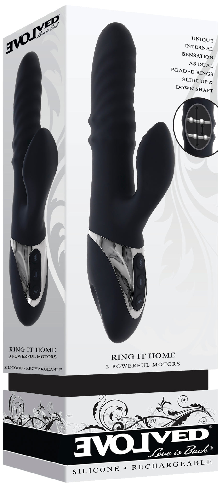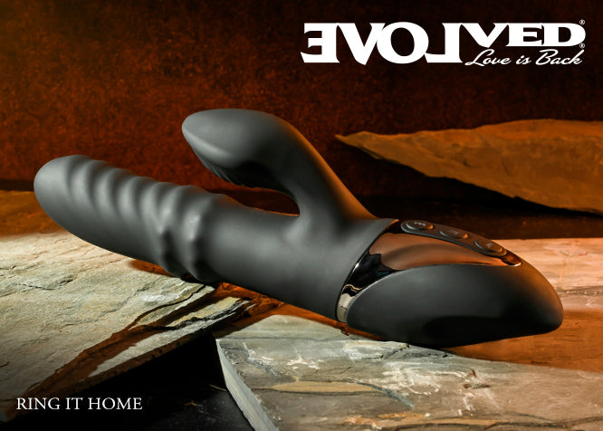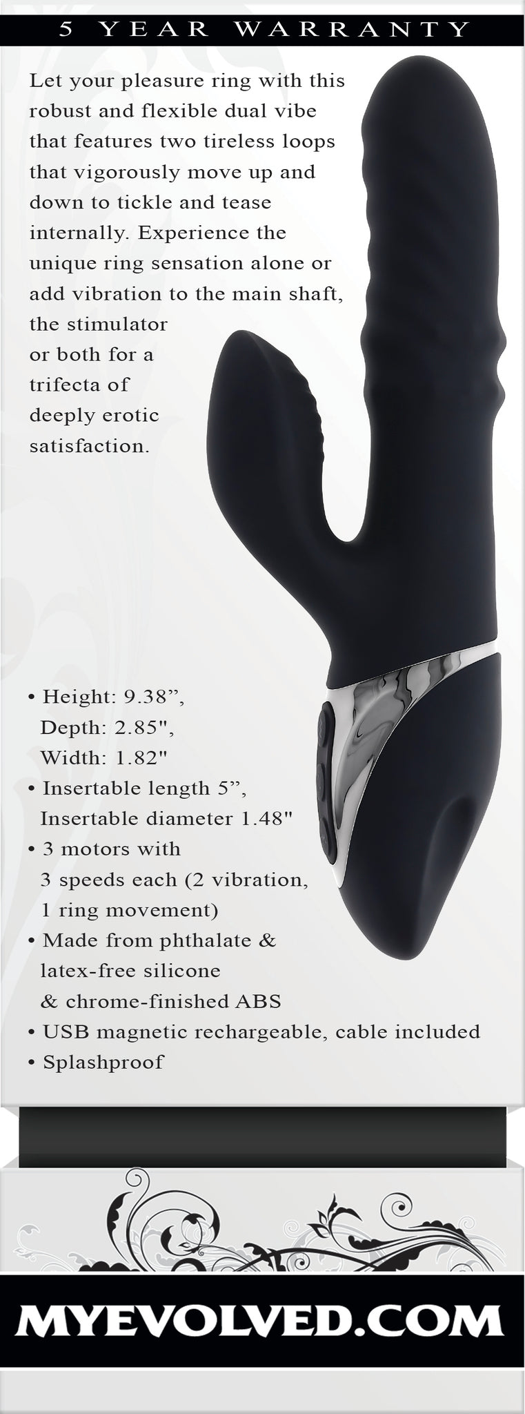 Evolved Ring It Home Vibrator. Let your pleasure ring with this robust and flexible dual vibe that features two tireless loops that vigorously move up and down to tickle and tease internally. Experience the unique ring sensation alone or add vibration to the main shaft, the stimulator or both for a trifecta of deeply erotic satisfaction. Size: height 9.38 inches, depth 2.85 inches, width 1.82 inches. Insertable length 5 inches, insertable diameter 1.48 inches. 3 motors with 3 speeds each. (2 Vibration, 1 Ring Movement. Made from phthalate free and latex free Silicone and Chrome finished ABS Plastic. USB magnetic rechargeable, cable included. Splashproof. Categories: Vibrators, Rabbit Style Vibrators, Eco-Friendly Sex Toys, Rechargeable Vibrators, Sex Toys for Women, G-Spot Rabbit Style Vibrators. 2024.