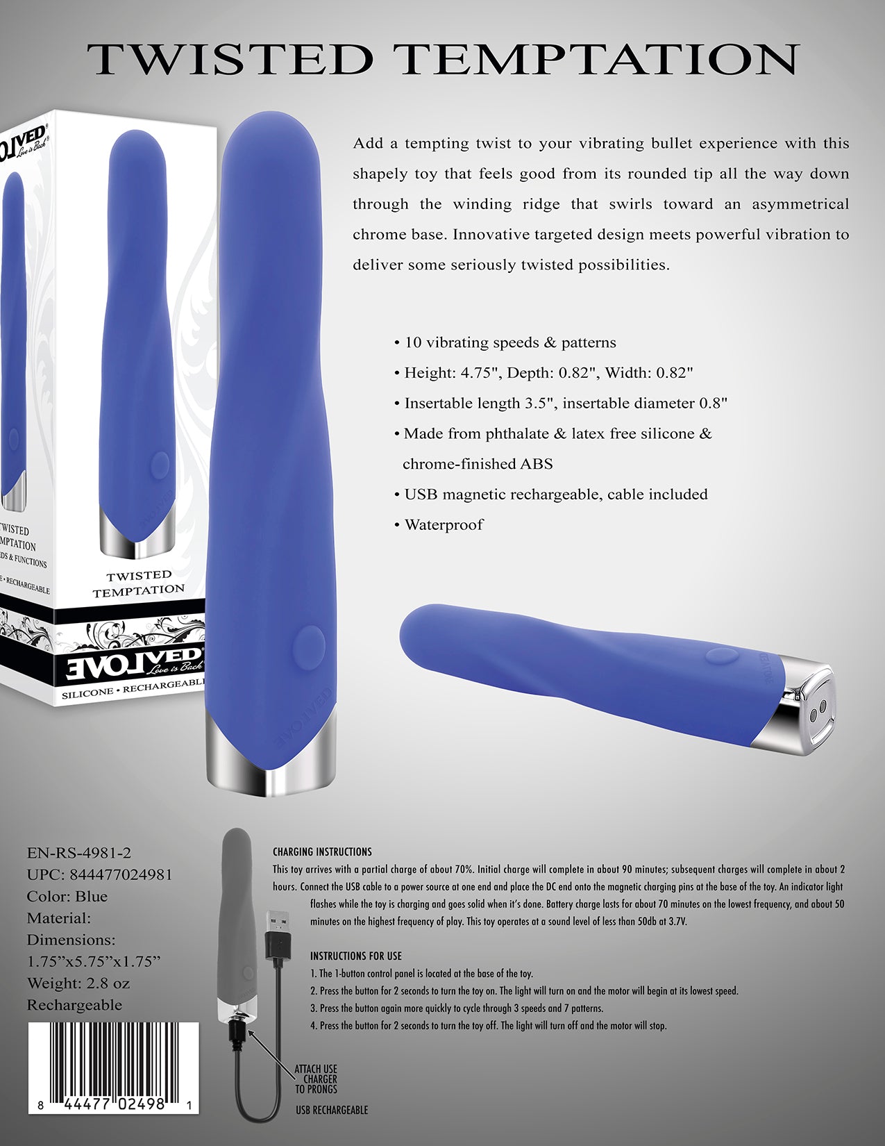 Features: 10 vibrating speeds and patterns. Height 4.75 inches, Depth 0.82 inch, Width 0.82 inch. Insertable length 3.5 inches, insertable diameter 0.8 inch. Made from phthalate free and latex free Silicone and chrome finished ABS Plastic. USB magnetic rechargeable, cable included. Waterproof. Categories: Vibrators, Classic Vibrators, Bullets, Eggs, Firm Vibrators, Eco-Friendly Sex Toys, Rechargeable Vibrators, Sex Toys for Women. 2024.
