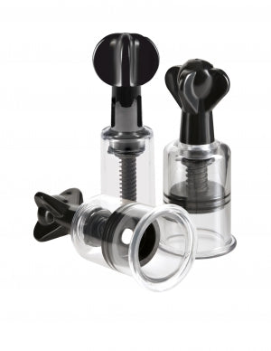 When you're looking for intense suction pleasure without the use of an external pump, the Fetish Fantasy Limited Edition Super Sucker Trio is the perfect choice for increasing clit and nipple sensitivity! With two powerful nipple suckers and a clever clitoral cylinder sucker, this kinky combo targets your body's most sensitive erogenous zones with amazing pump-less suction satisfaction. Place the clear cylinders over your nipples and clit and lower the suction dials counter-clockwise until they're flush with your skin. The smooth cylinders feel great against your skin and stay put when the action heats up. Apply a gentle amount of pressure to the cylinder to ensure a tight seal against your body and twist the top clockwise to activate the suction. With each turn of the twist dial, the suckers will increase blood flow to the focused area and increase sensitivity. Once you unscrew the dial and relieve the pressure, your nipples and clit will remain perky, extra sensitive, and ready to rock for whatever happens next! Best of all, these incredible super suckers deliver mind-blowing suction without the use of a bulky external pump. Whether you enjoy the visual treat of your newly enlarged nipples and clit or you prefer the fantastic feeling you get from these amazing pleasure pumps, this trio of twisters is a must-have accessory for your next fetish fantasy! Material: ABS Plastic and rubber Length: 4 in. - ( 10.2 cm ) Width: 1.25 in. - ( 3.1 cm ) Height: 1.25 in. - ( 3.1 cm ) Weight: 1.25 oz. ( 36.85 grams )