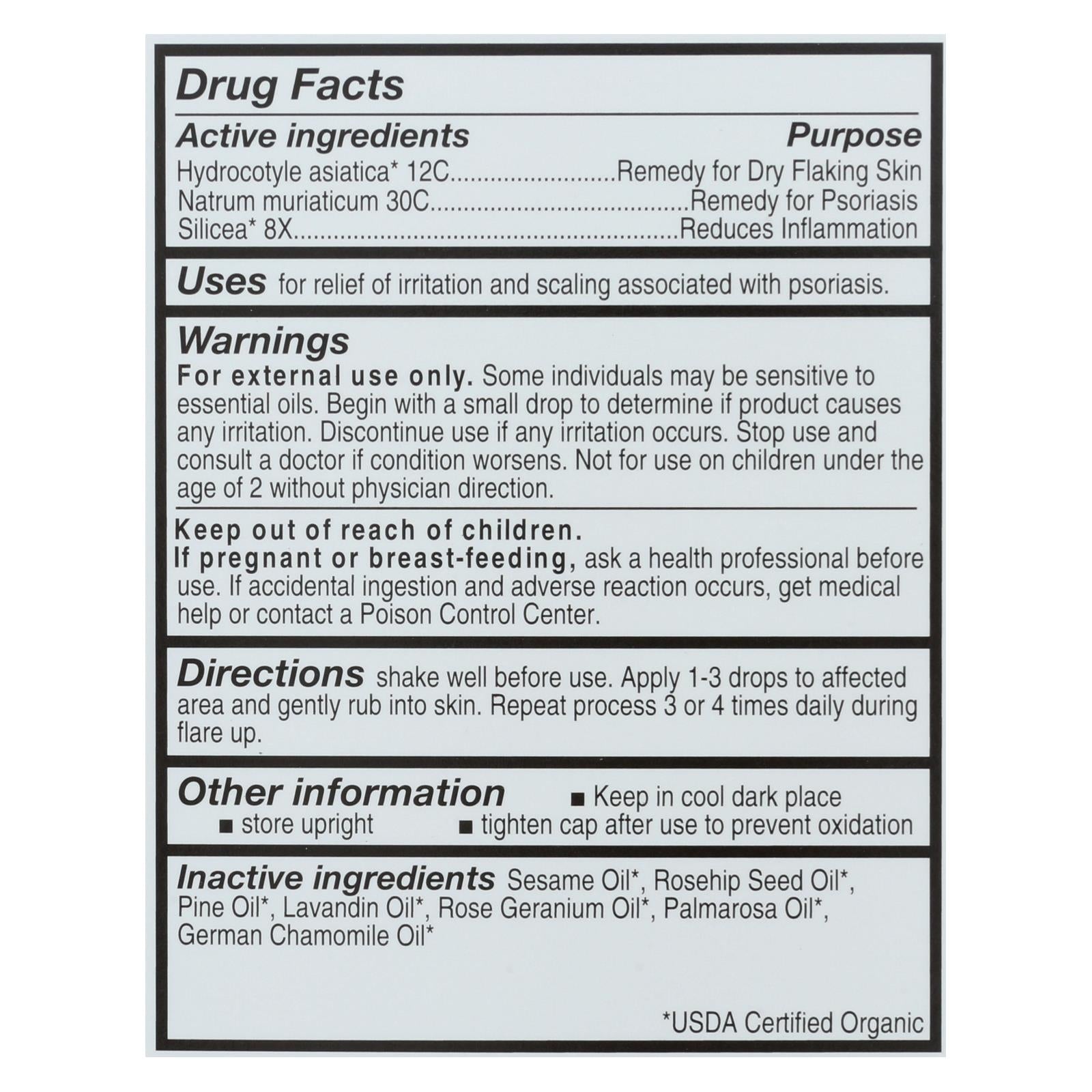 ingredients : sesame oil;rosehip seed oil;pine oil;lavandin oil;rose geranium oil;palmarosa oil;german chamomile oil;hydrocotyle asiatica* 12c purpose remedy for dry flaking skin natrum muriaticum 30c purpose remedy for psoriasis silicea* 8x purpose reduces inflammation