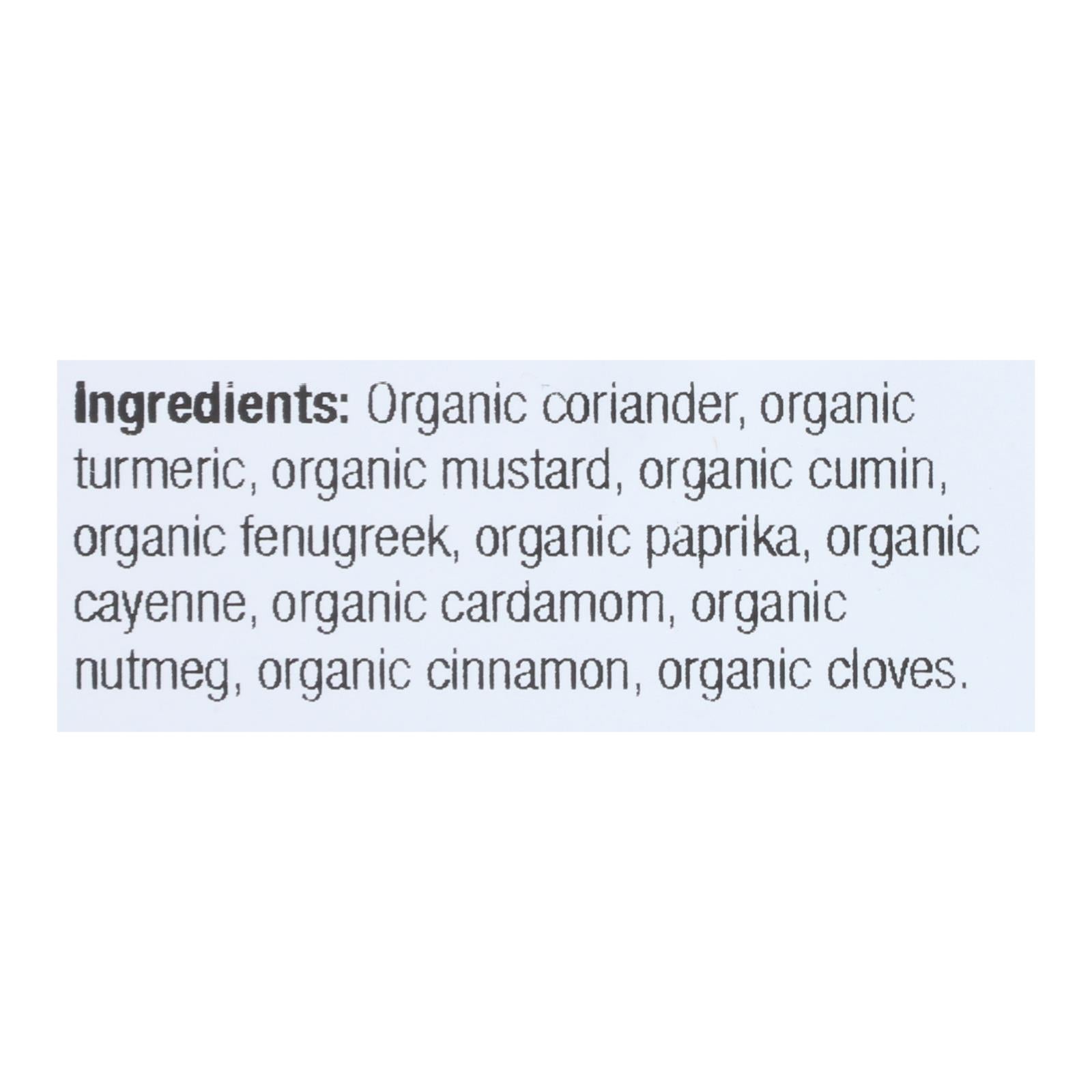 ingredients : organic coriander;organic turmeric;organic mustard;organic cumin;organic fenugreek;organic paprika;organic cayenne;organic cardamom;organic nutmeg;organic cinnamon;organic cloves
