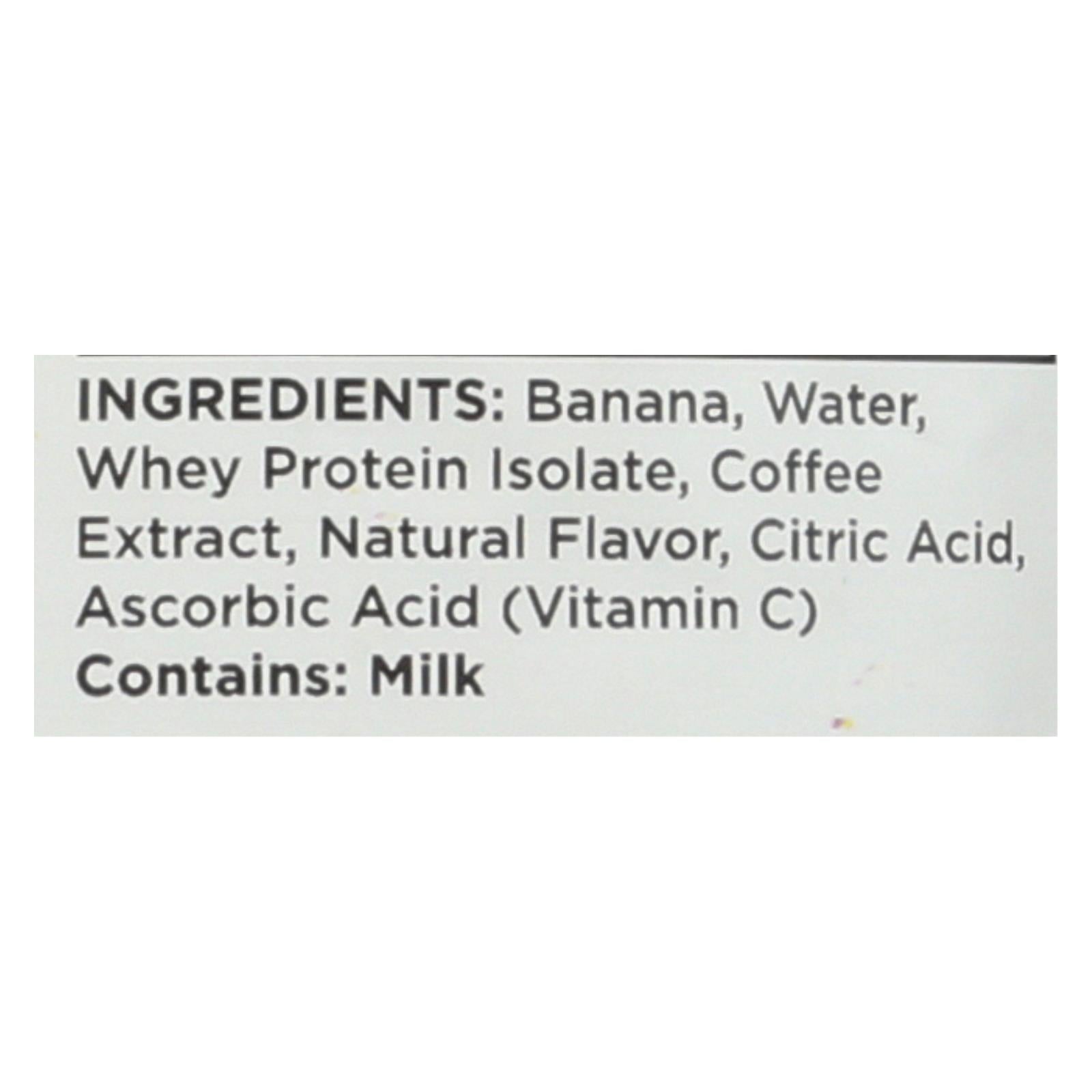 ingredients : banana;water;whey protein isolate;coffee extract;natural flavor;citric acid and ascorbic acid (to maintain freshness)