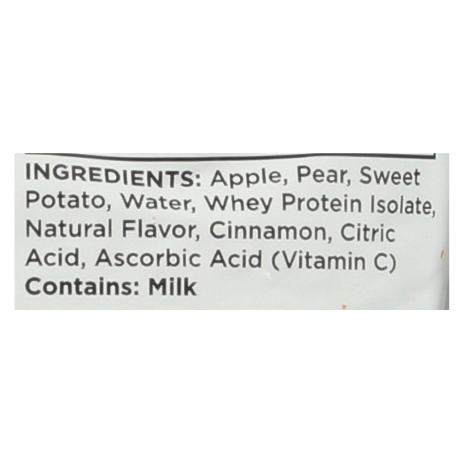 ingredients : apple;pear;water;sweet potato;whey protein isolate;natural flavor;cinnamon;citric acid and ascorbic acid (to maintain freshness)
