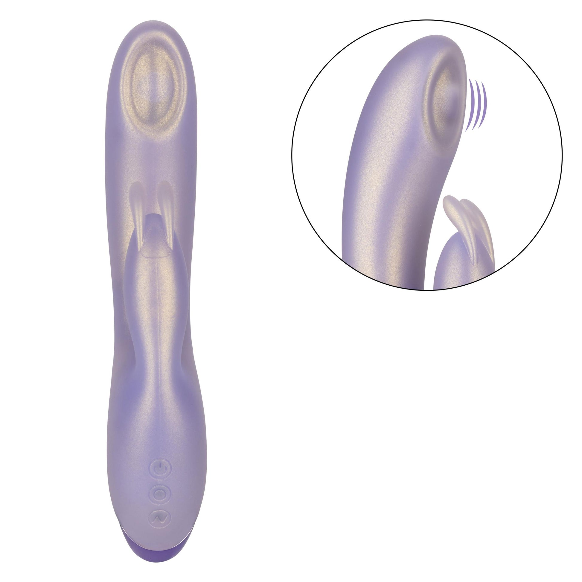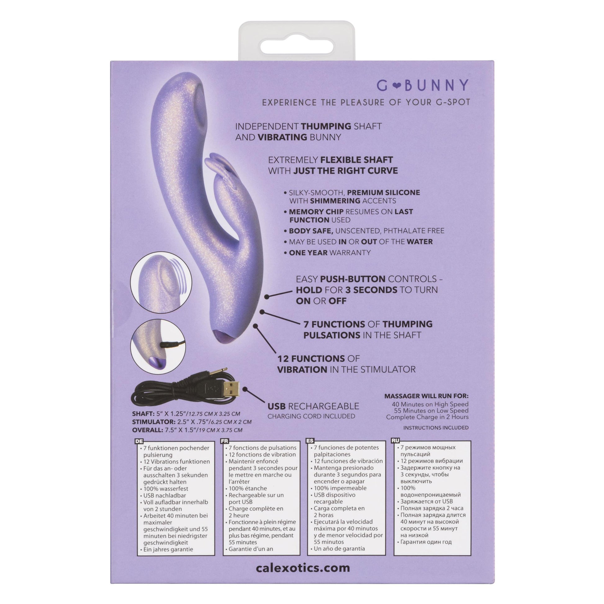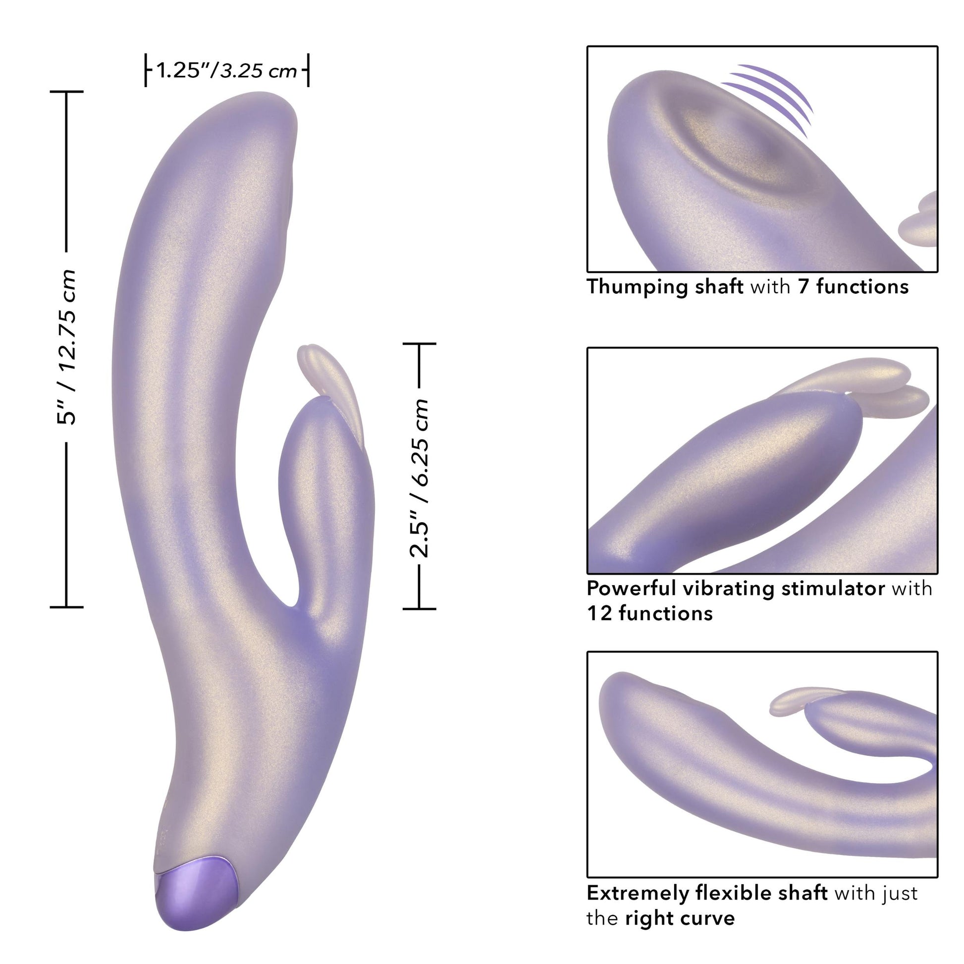 G shaft, 7 independent functions of thumping action and 12 independent functions of vibrations. The sensually curved thumping shaft and flickering rabbit stimulator are perfect for teasing internal and external sweet spots. For an ultra smooth surface and flexible body, the flickering stimulator and massager are covered in a shimmering Silicone