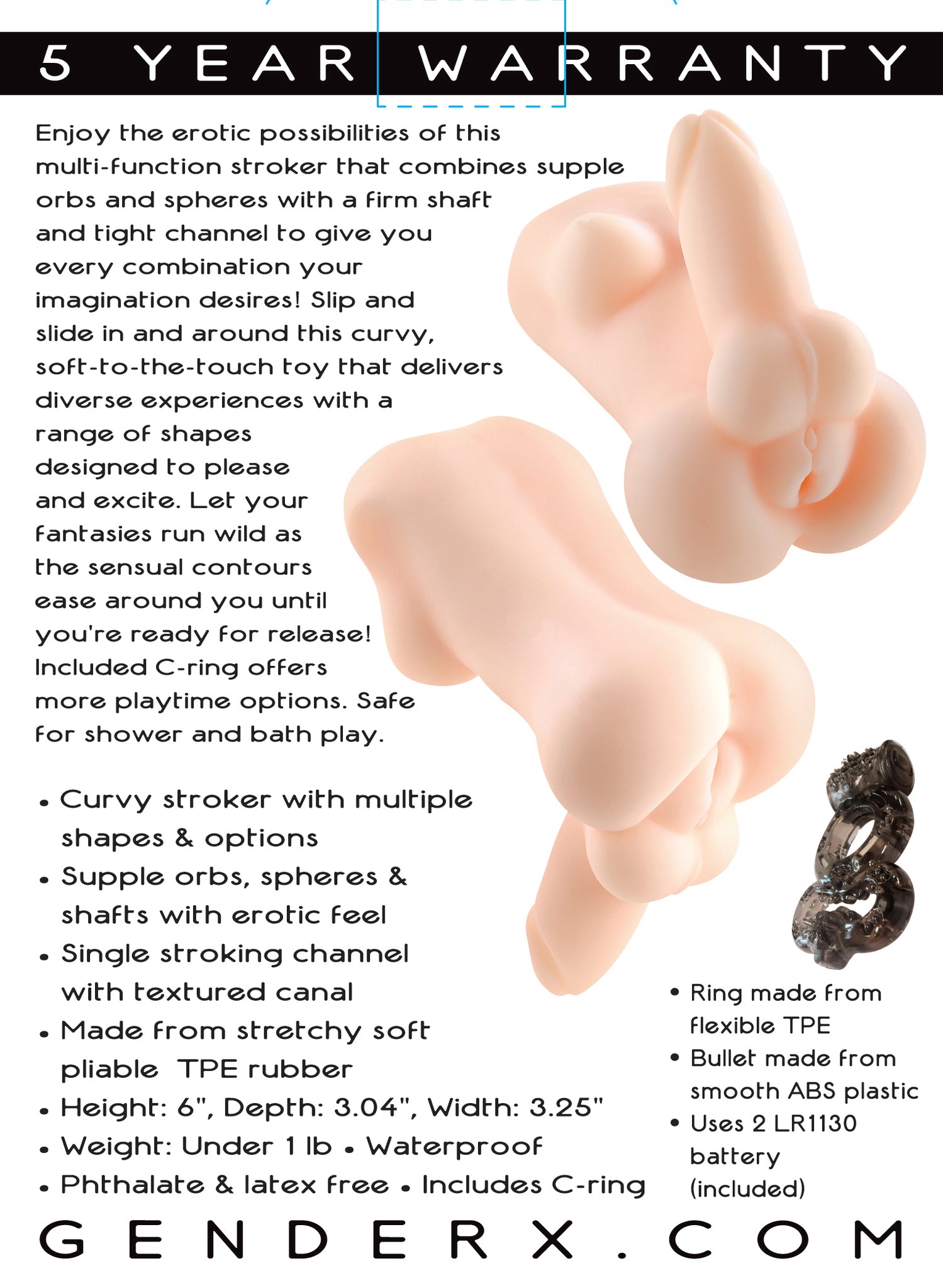 Specifications: curvy stroker with multiple shapes and options. Supple orbs, spheres and shafts with erotic feel. Single stroking channel with textured canal. Made from stretchy soft pliable Thermoplastic Elastomers TPE. Height 6 inches, depth 3.04 inches, width 3.25 inches. Bulk weight under 1 pound. Phthalate free and latex free. Waterproof, non-vibrating strokers. Includes vibrating cock ring with 2 LR1130 batteries pleasure ring for maximium sensations. Made uisng body safe, phthalate free materials. Thermoplastic Elastomers TPE. 5 years warranty. Categories: Male Masturbators, Sex Toys for Men, Realistic Vibrating Strokers, Solo Masturbators. 2023.